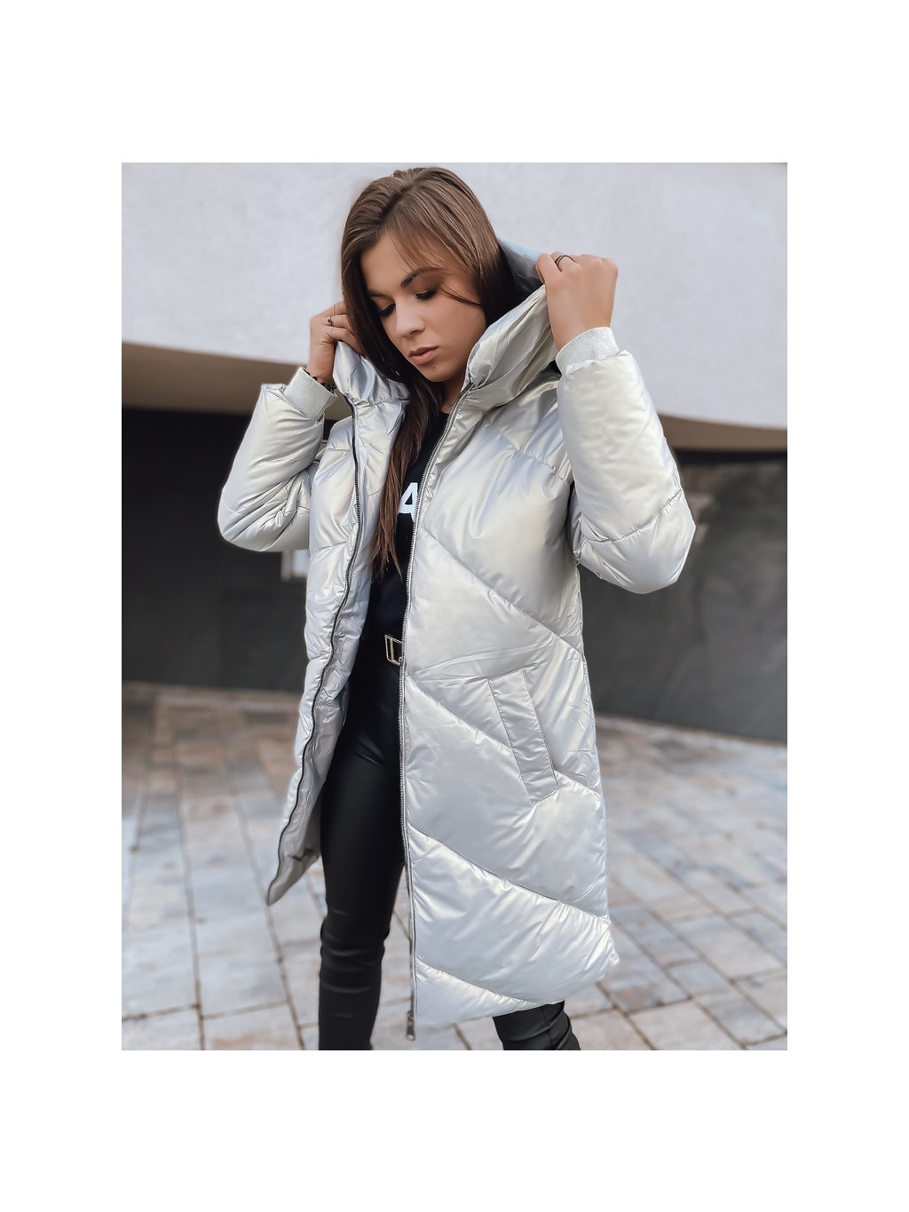 (VEL. L) SVĚTLE ŠEDÝ DÁMSKÝ LESKLÝ ZIMNÍ PROŠÍVANÝ KABÁT SE ZLATÝMI ODLESKY