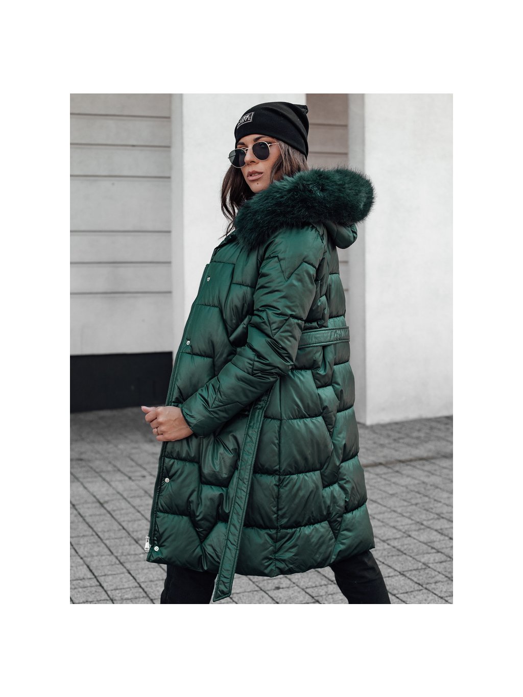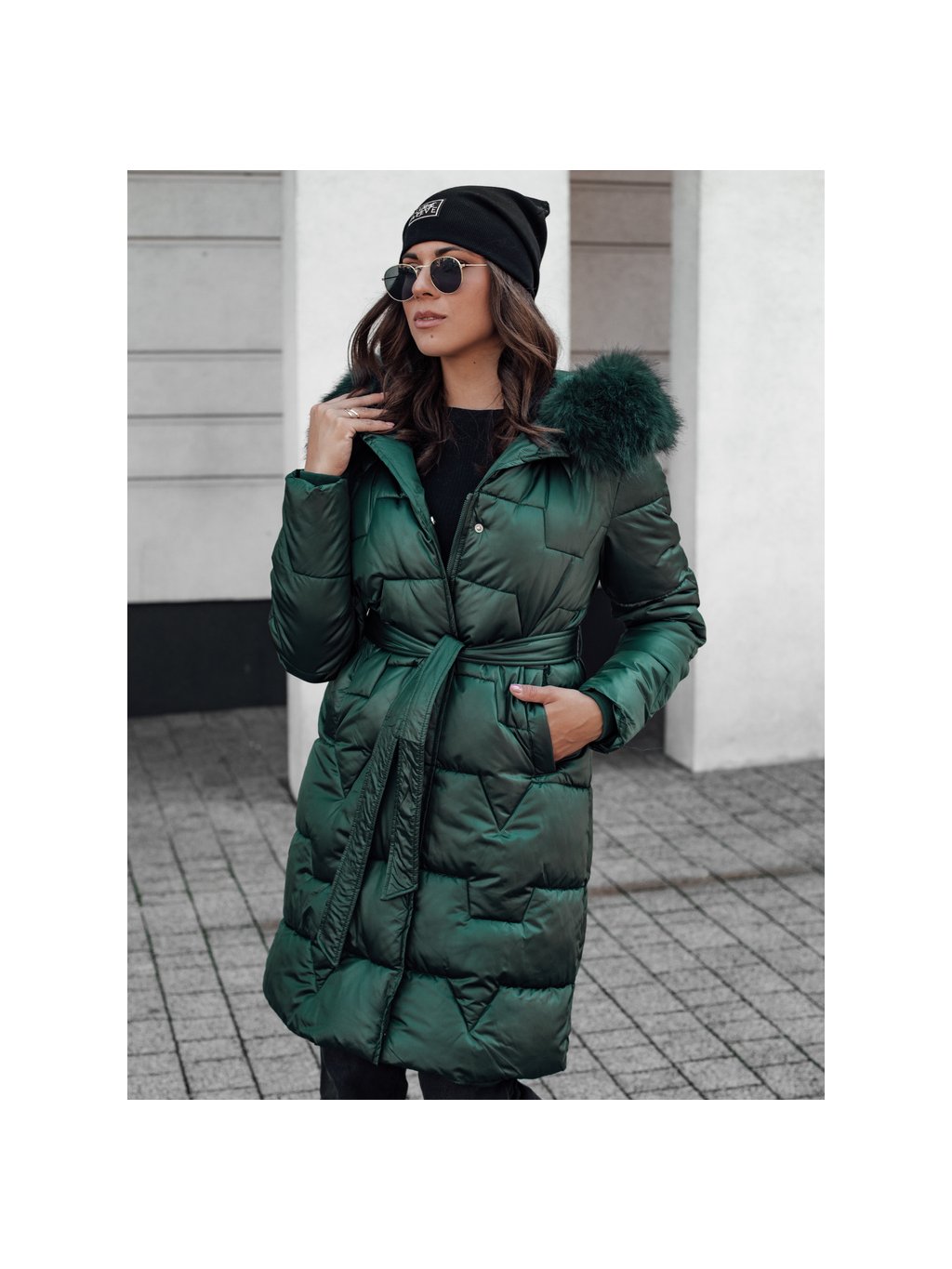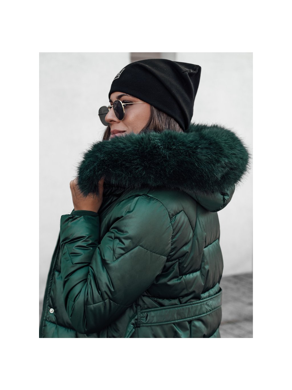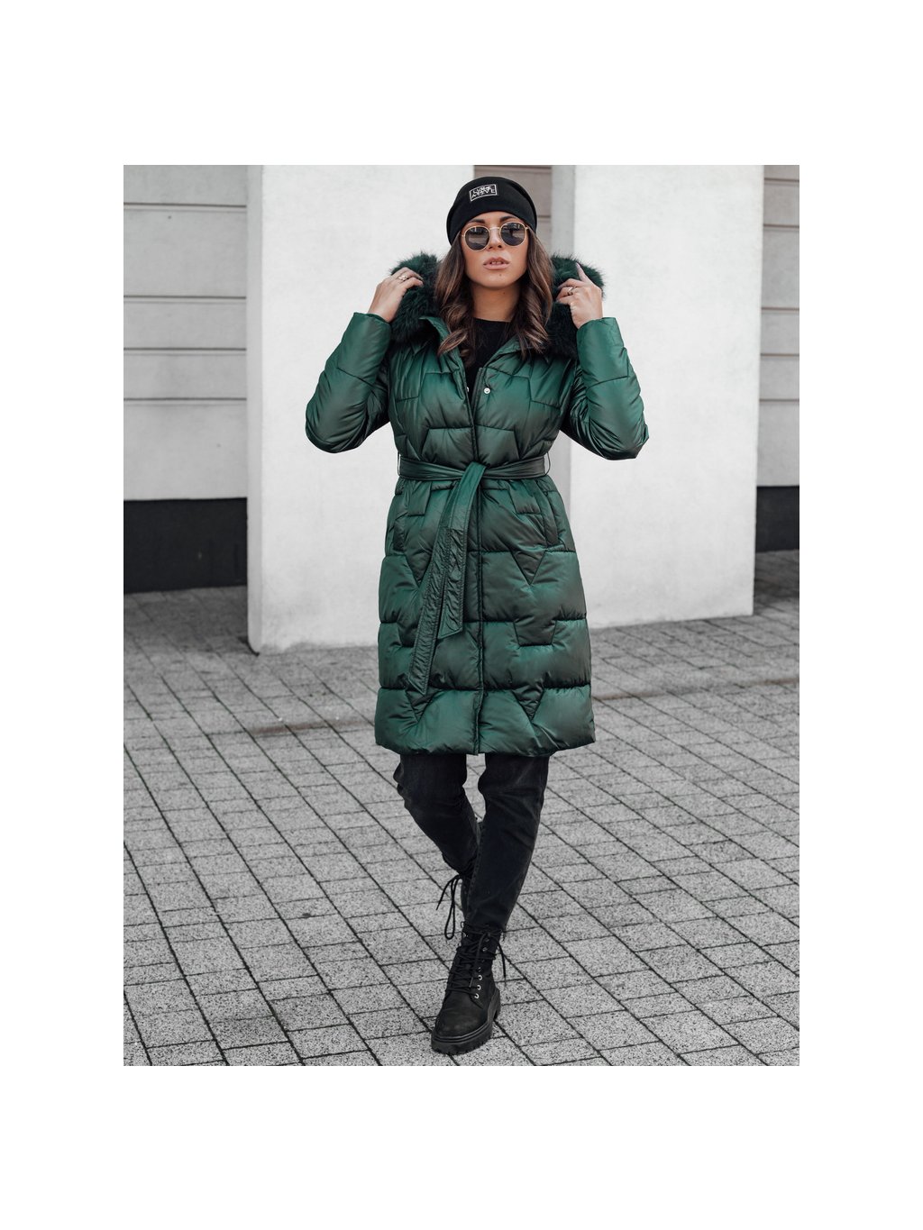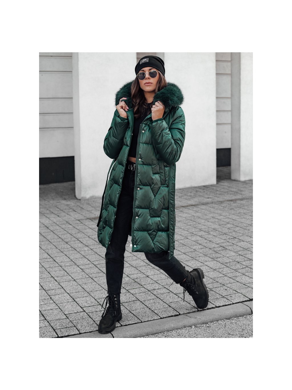 (VEL. L) TMAVĚ ZELENÁ DÁMSKÁ DLOUHÁ PROŠÍVANÁ ZIMNÍ BUNDA S KOŽÍŠKEM STYLOWQ