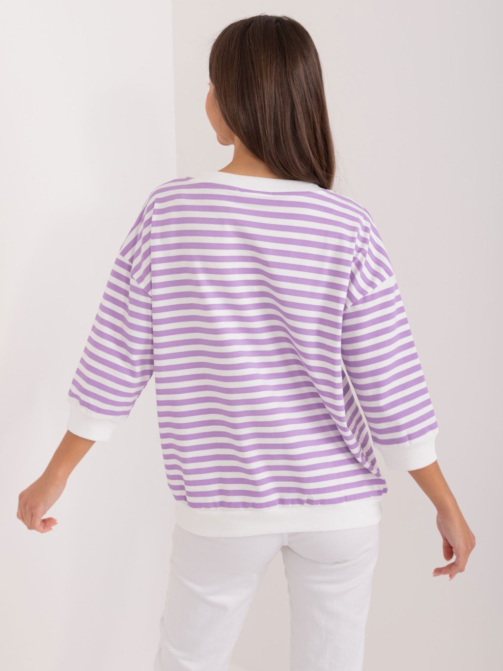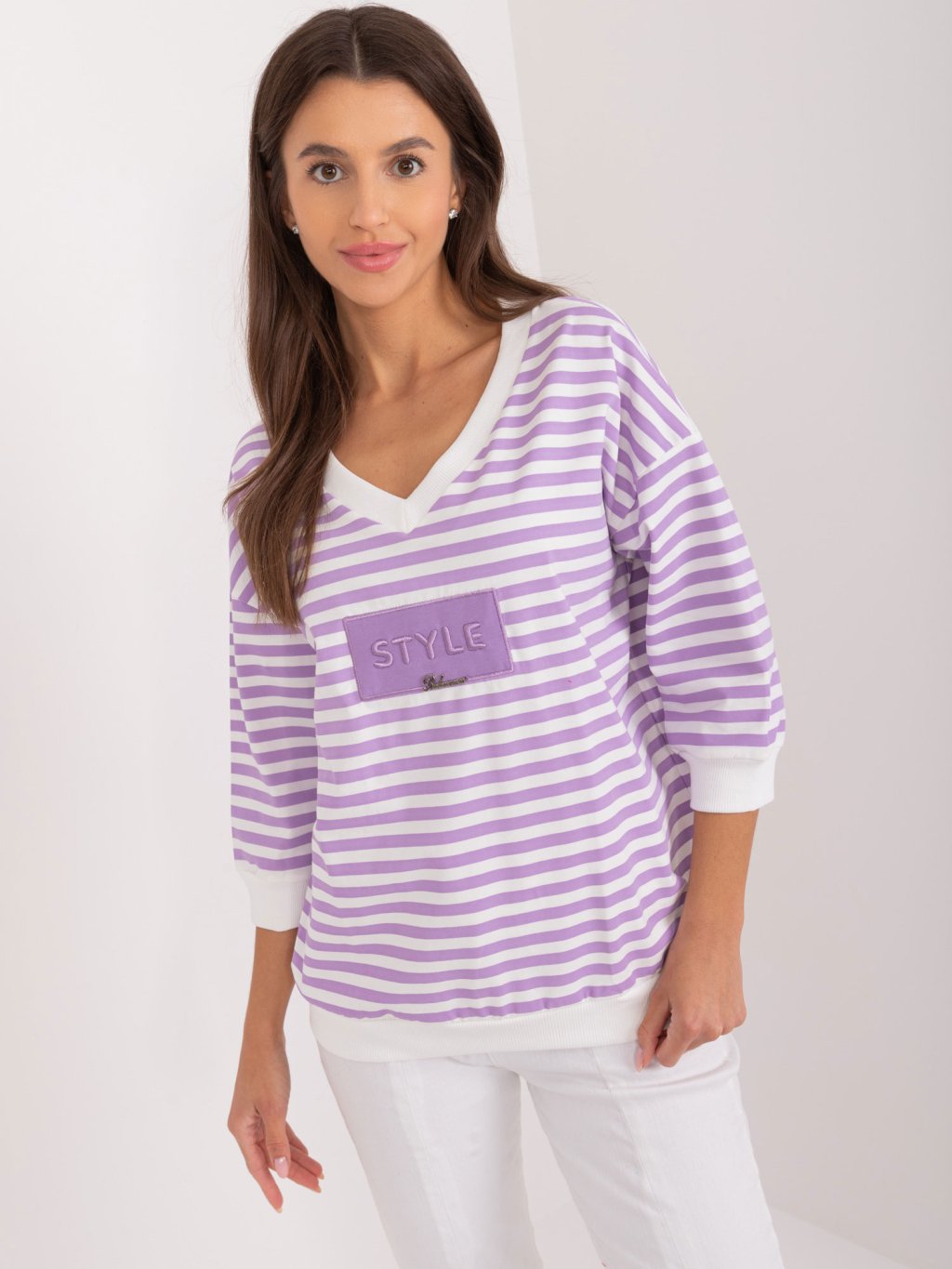 (VEL. ONE SIZE) BÍLO-FIALOVÉ PRUHOVANÉ TRIKO S VÝSTŘIHEM A 3/4 RUKÁVEM