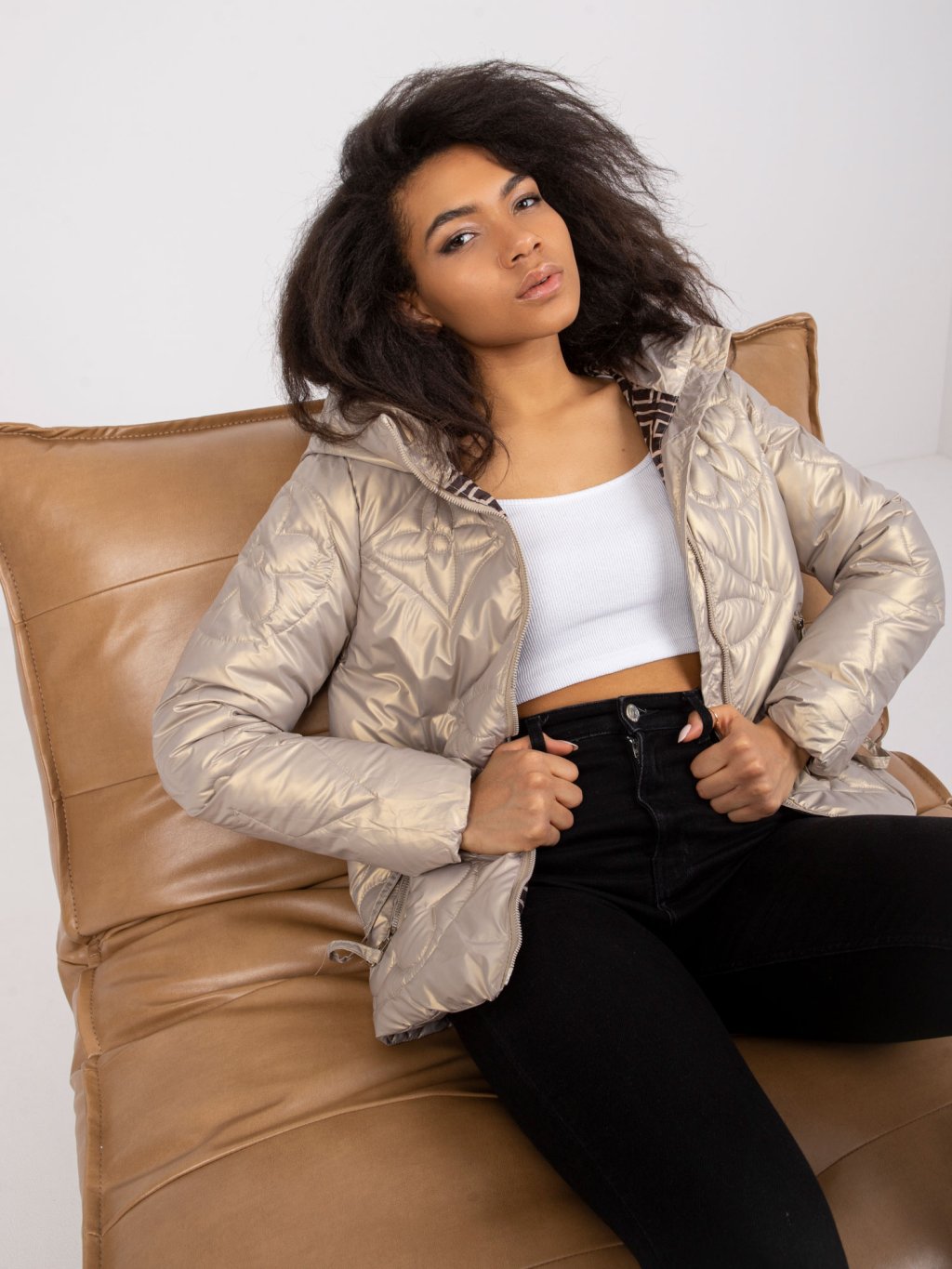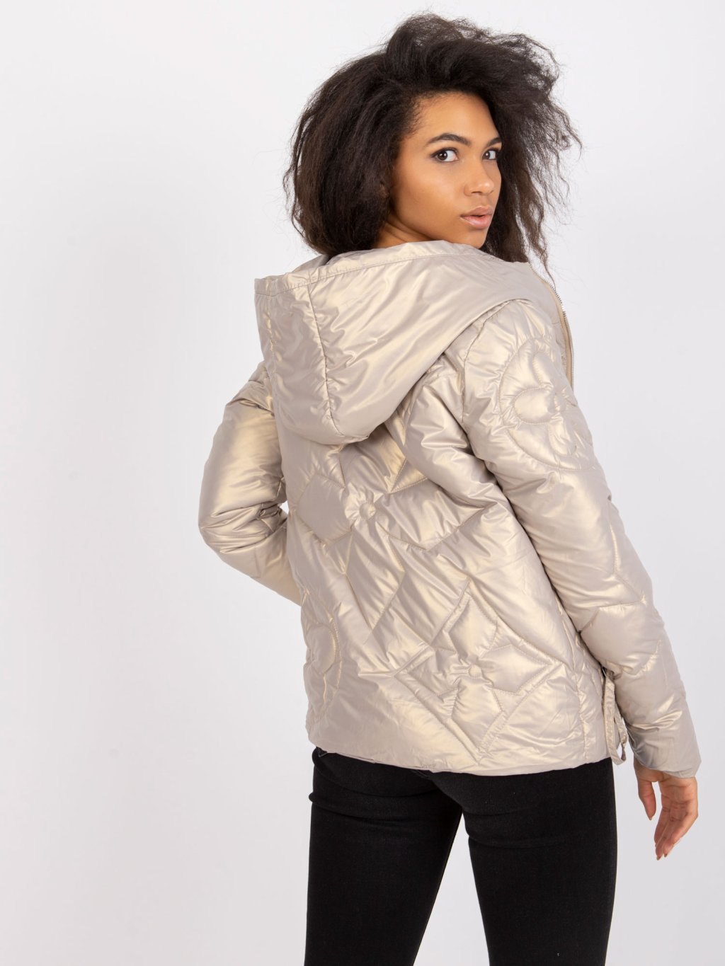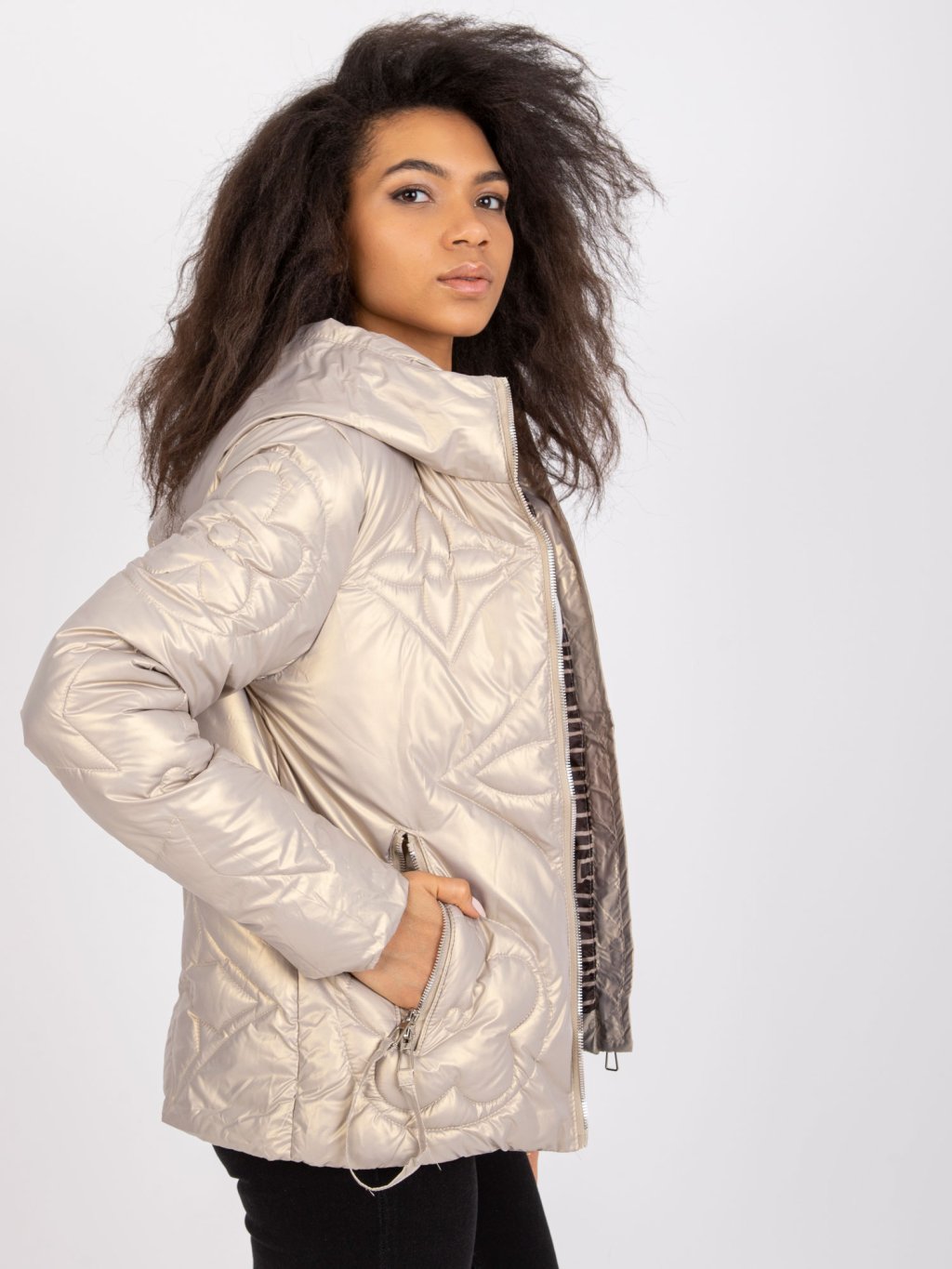 (VEL. S) BÉŽOVÁ LESKLÁ BUNDA HANOI S PROŠÍVANÝMI KVĚTY