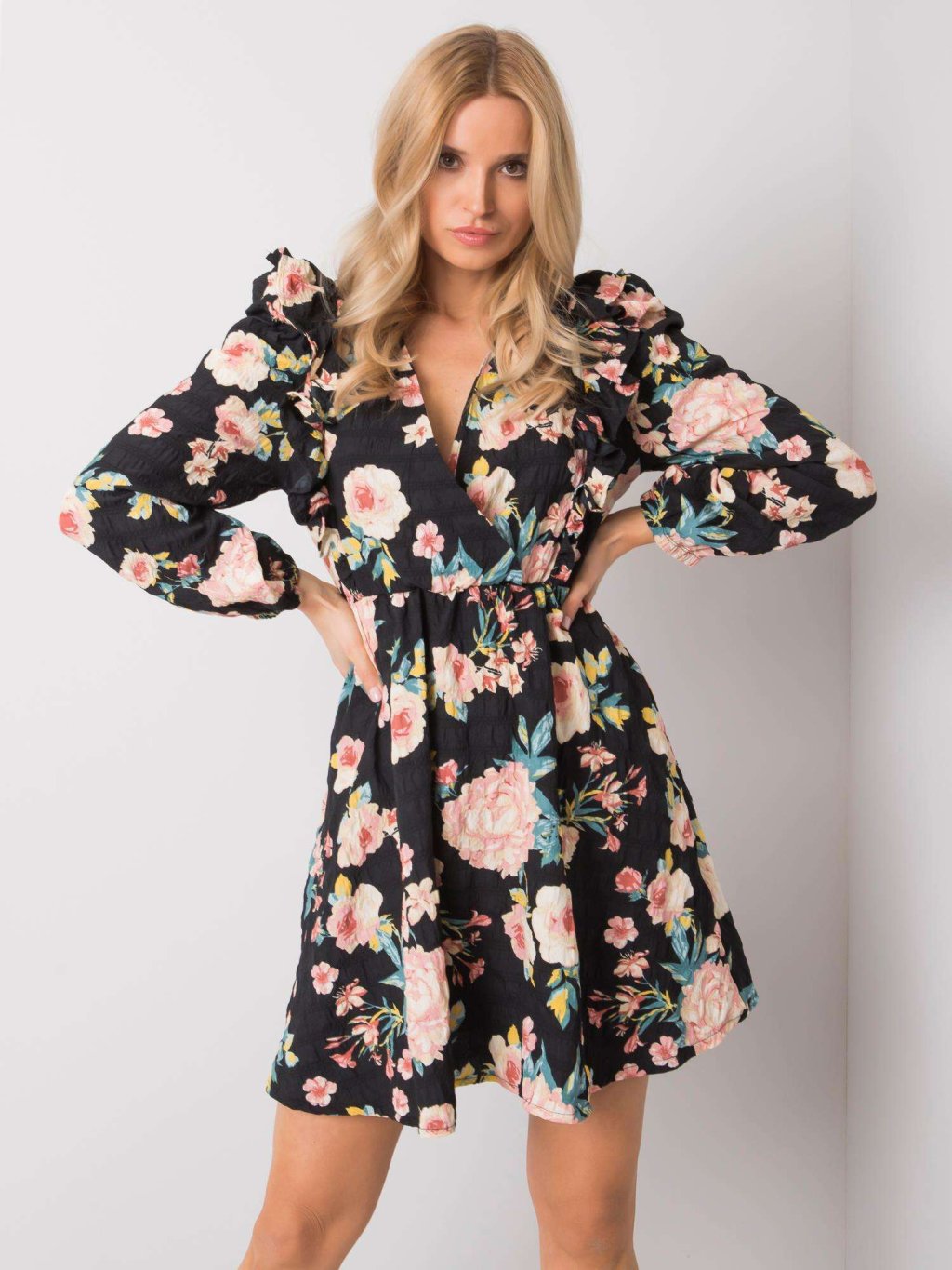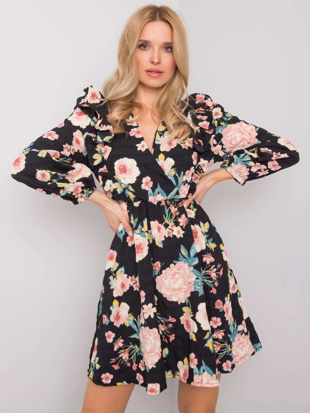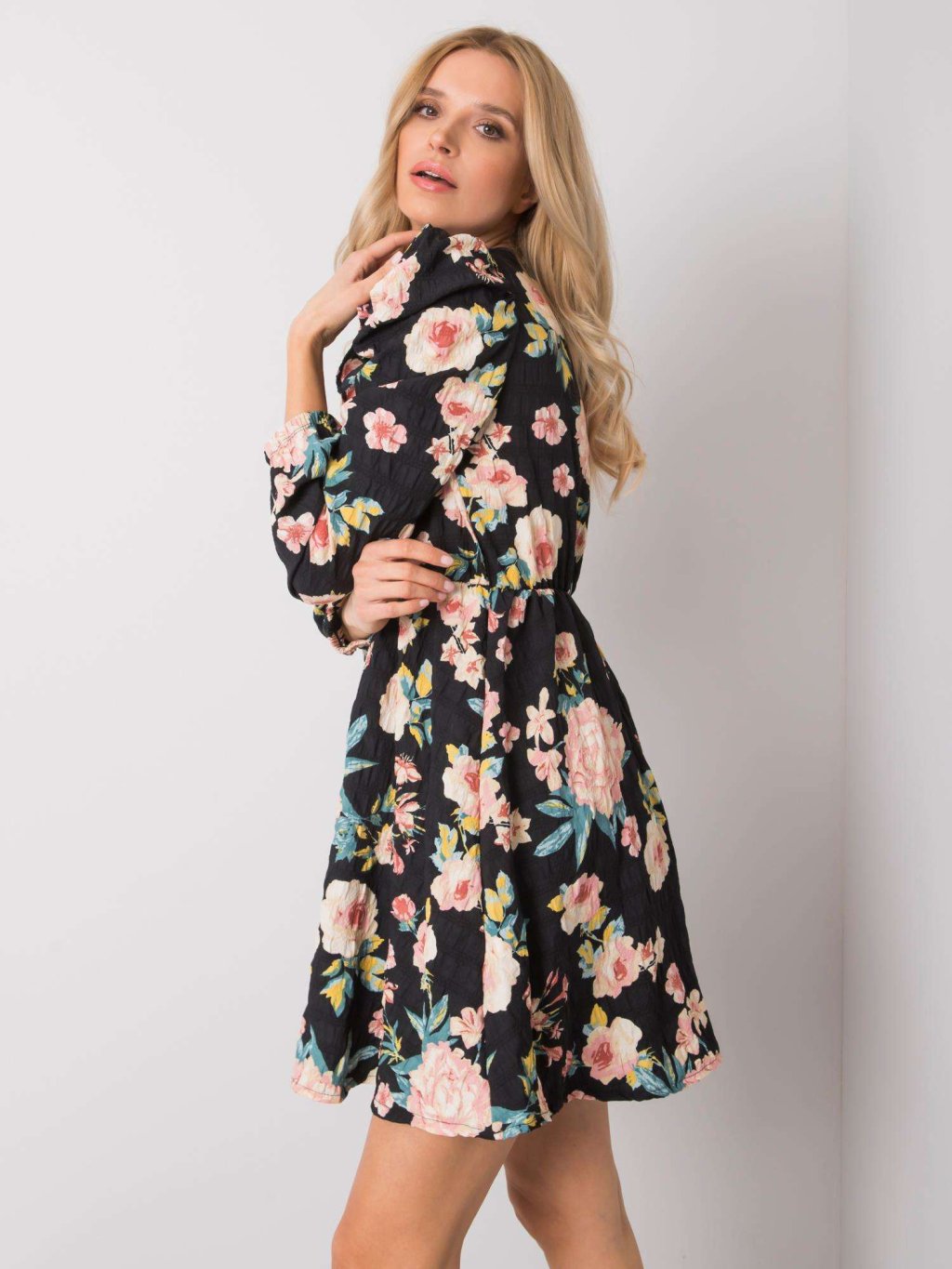 (VEL. S) ČERNÉ DÁMSKÉ ŠATY S KVĚTINAMI