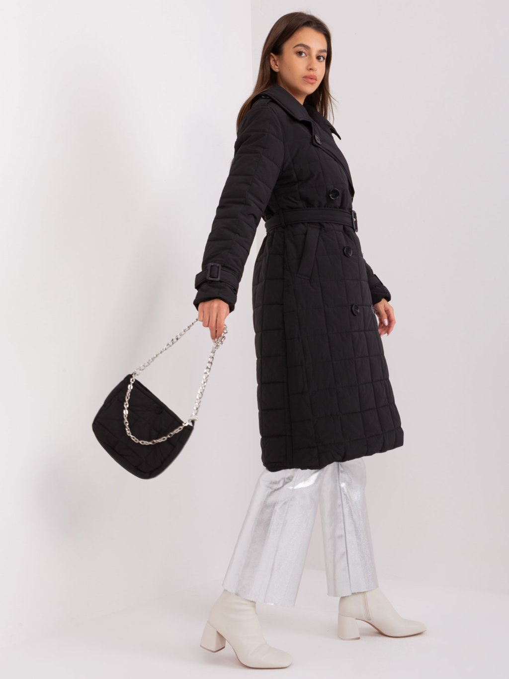 (VEL. S) ČERNÝ PROŠÍVANÝ DLOUHÝ KABÁT S PÁSKEM