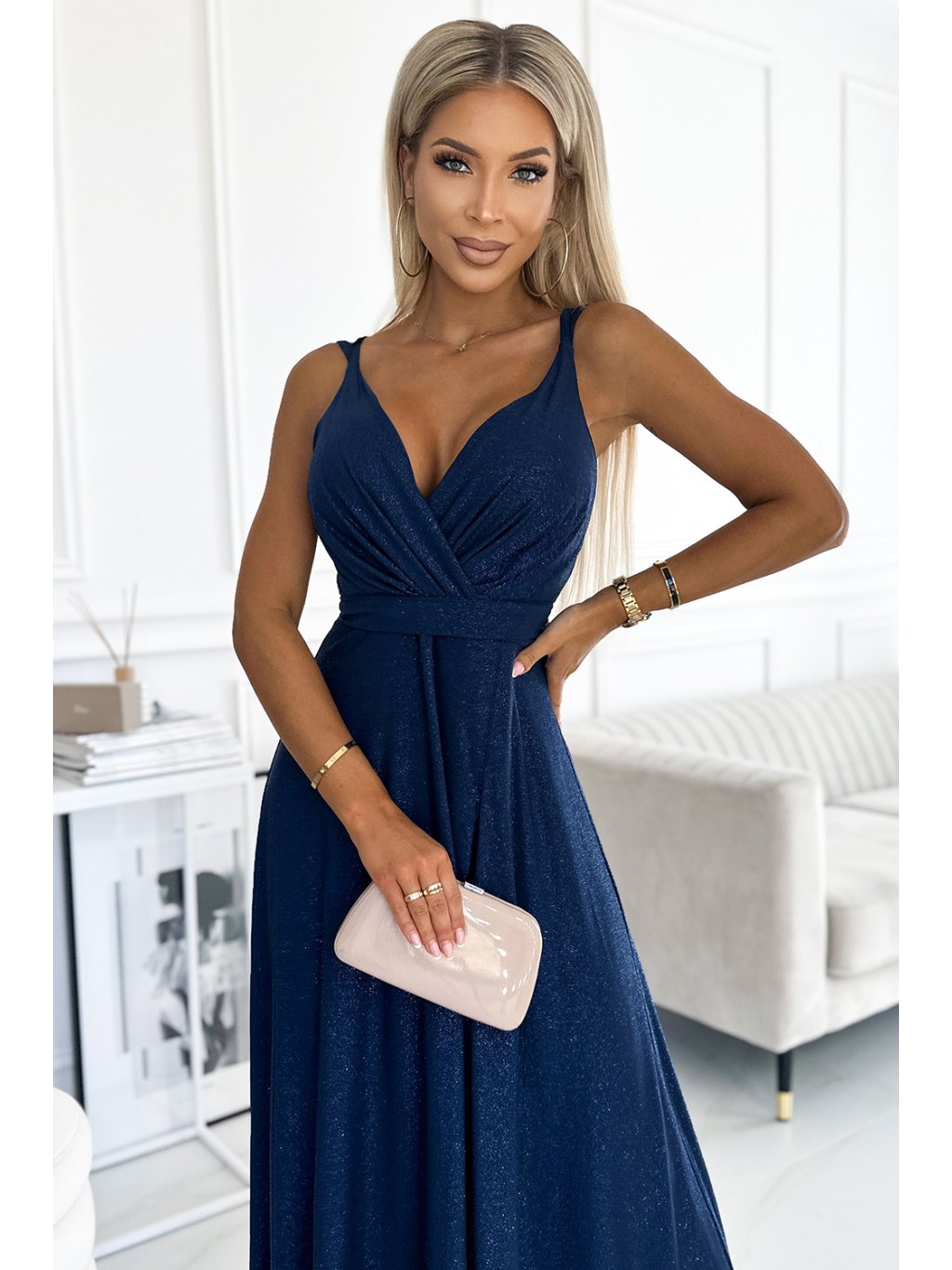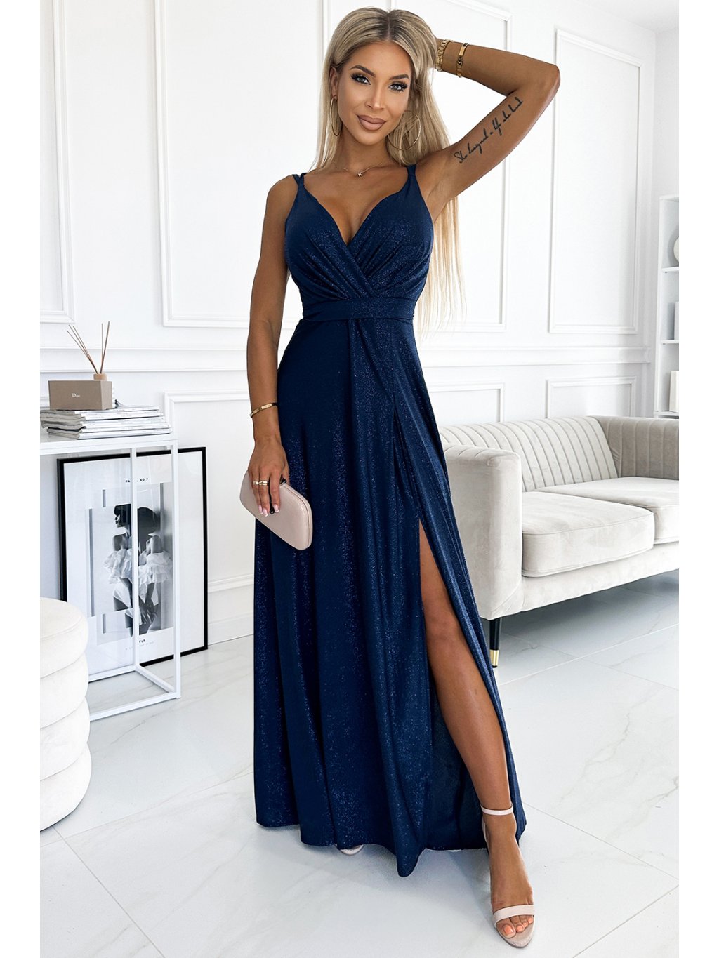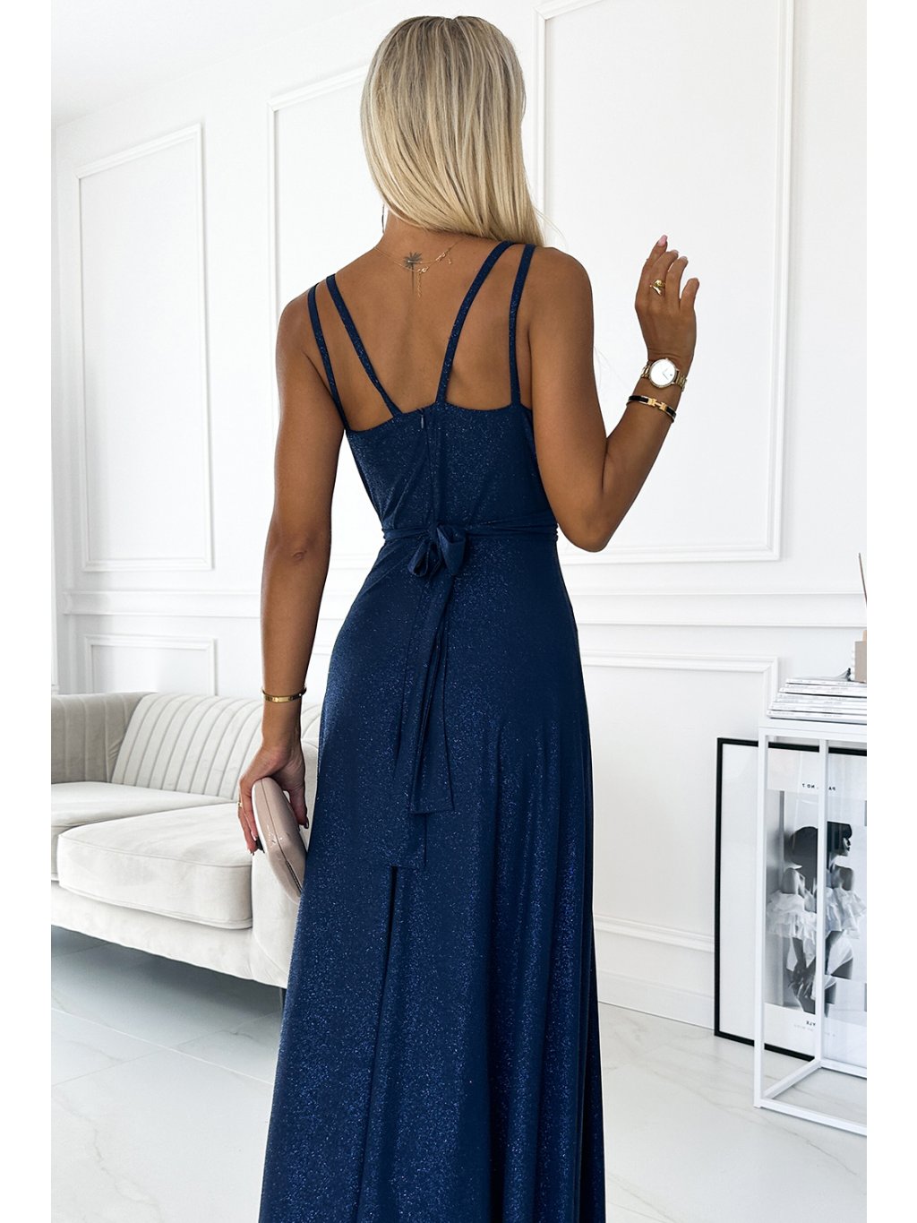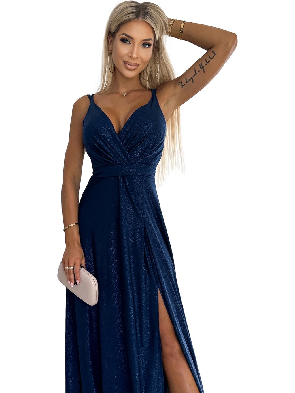 (VEL. XL) DLOUHÉ TMAVĚ MODRÉ TŘPYTIVÉ ŠATY S VÝSTŘIHEM A DVOJITÝMI RAMÍNKY