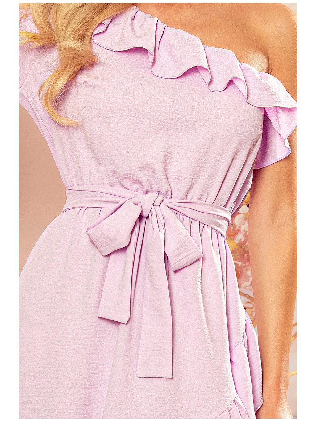 (VEL. XL) SVĚTLE FIALOVÉ ŠATY NA JEDNO RAMENO S VOLÁNKY ROSITA