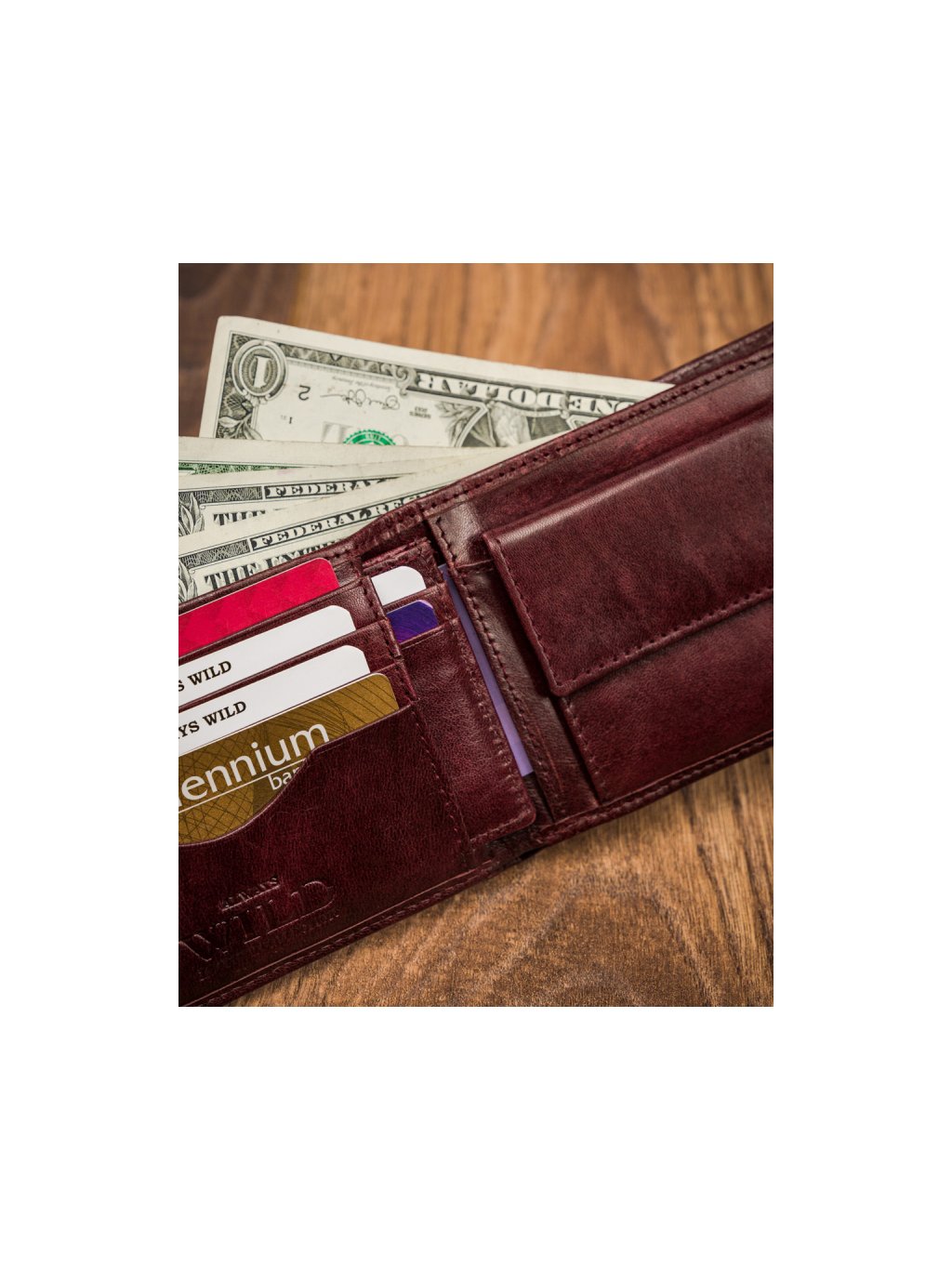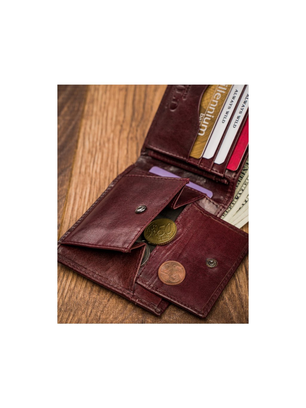 - uvnitř je kapsa na mince, přihrádka na bankovky, 8 míst na karty