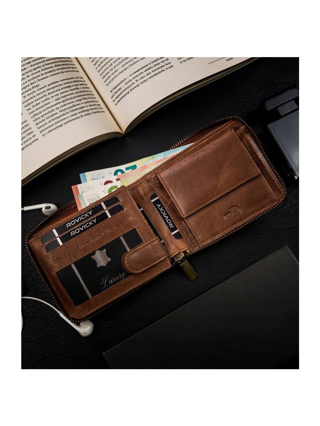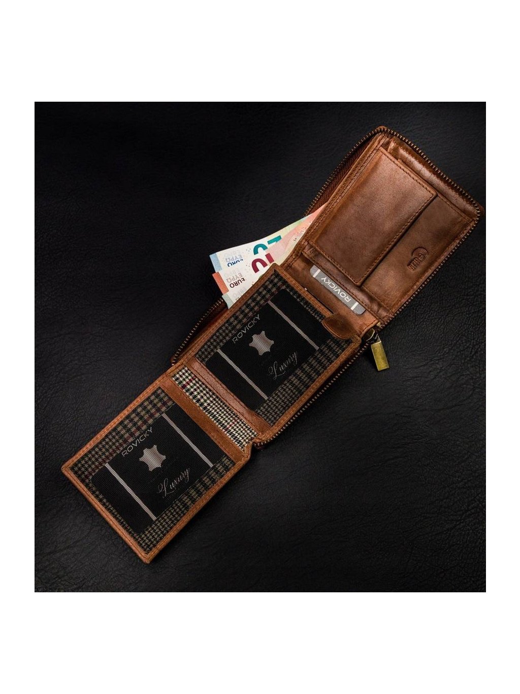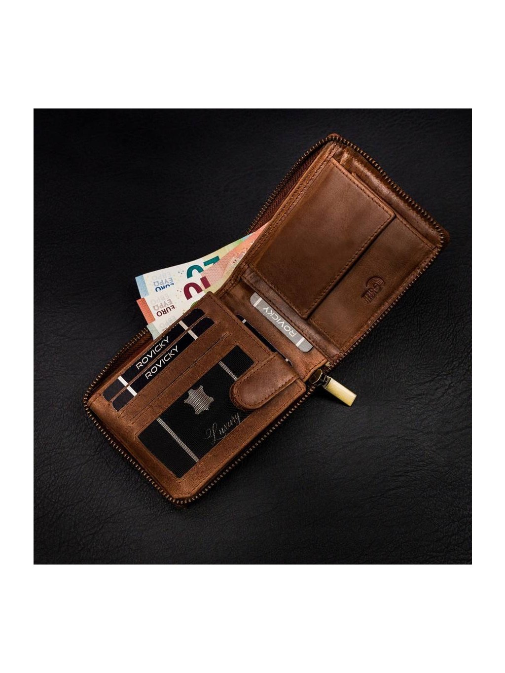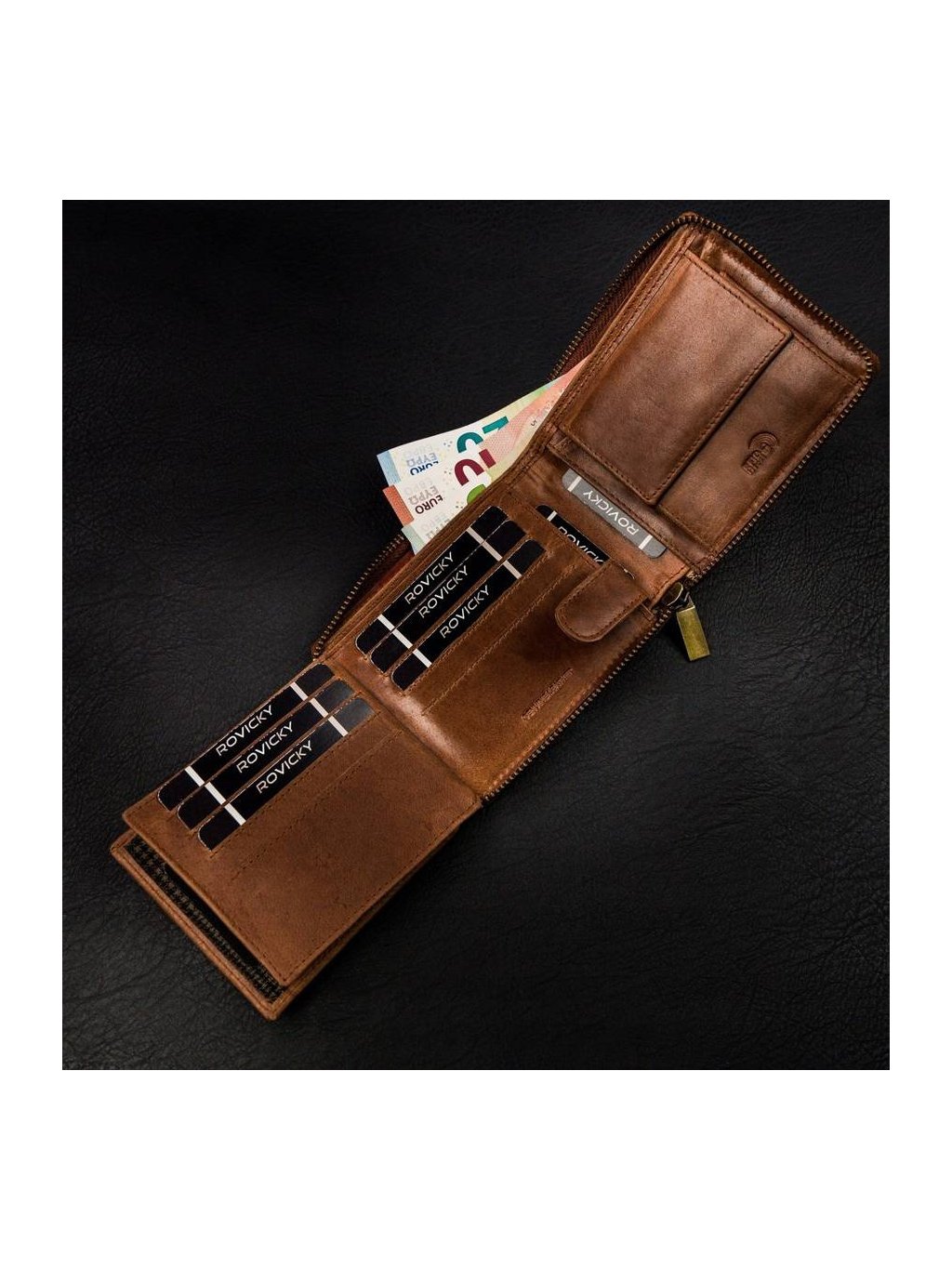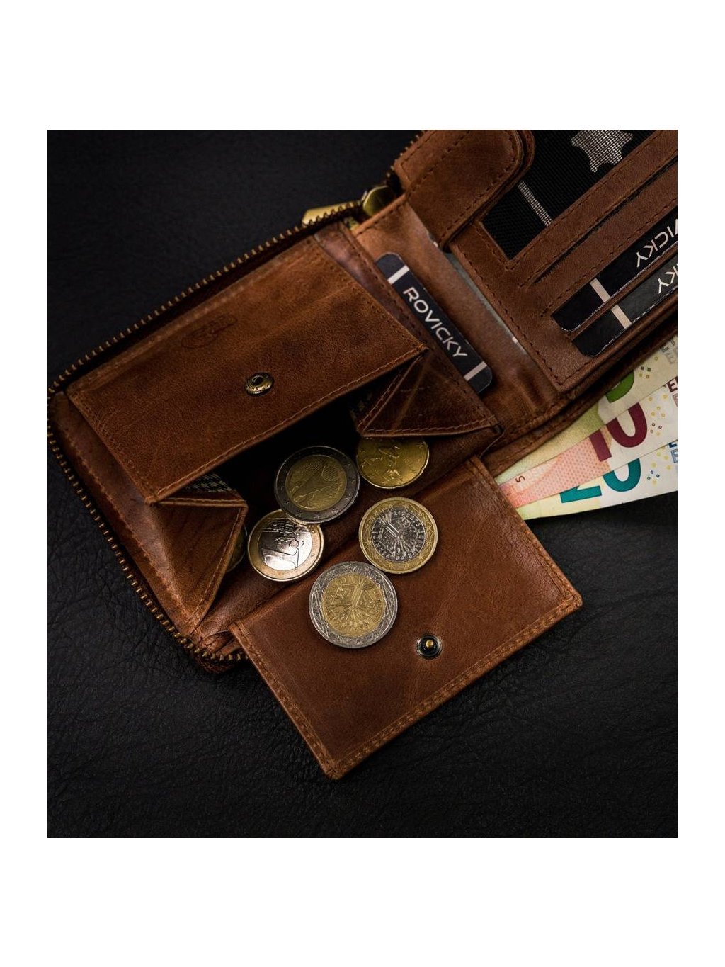 - uvnitř jsou 2 přihrádky na bankovky, kapsa na mince, 11 míst na karty, 4 místa na větší doklady