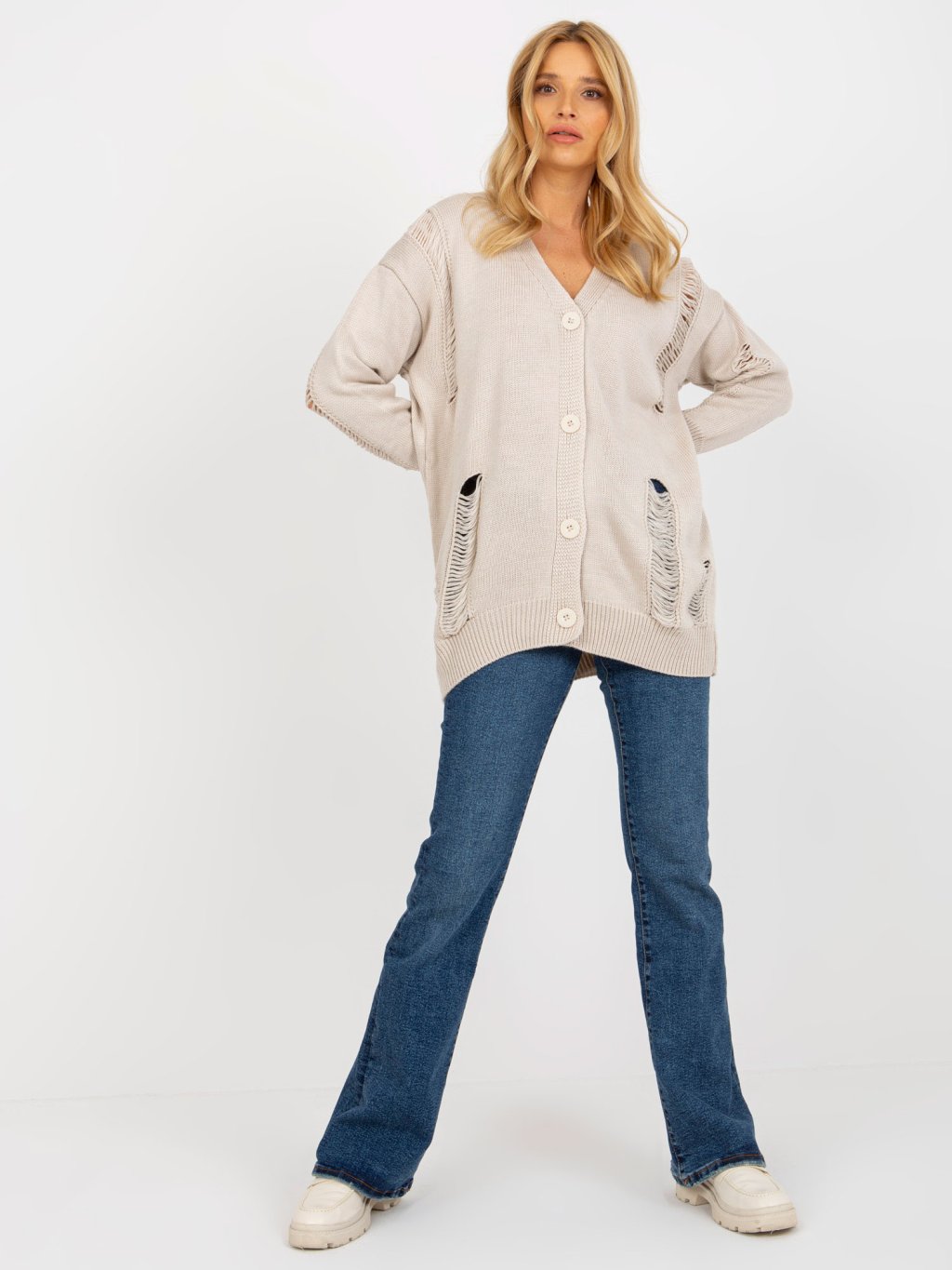 BÉŽOVÝ KARDIGAN NA KNOFLÍKY S DÍRAMI