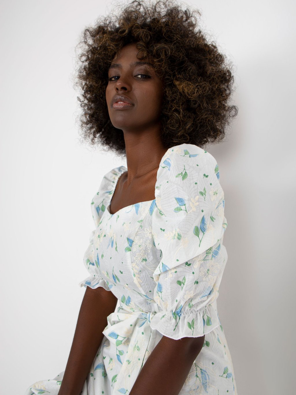 Modelka na obrázcích je vysoká 168 cm, obvod přes prsa 82 cm, obvod pasu 62 cm a boky 93 cm.