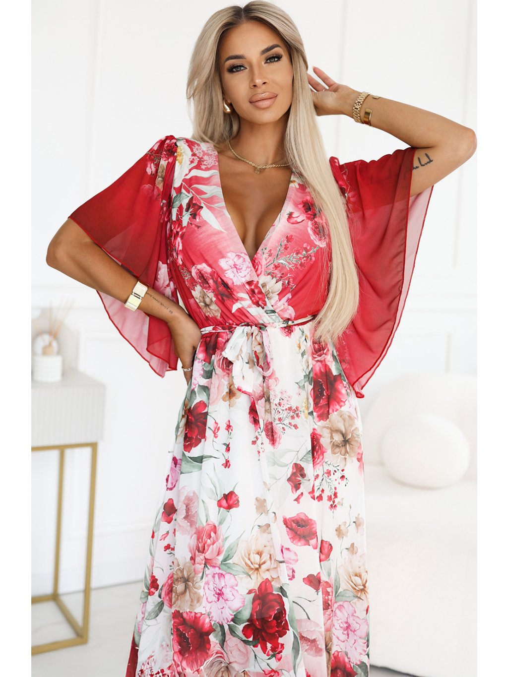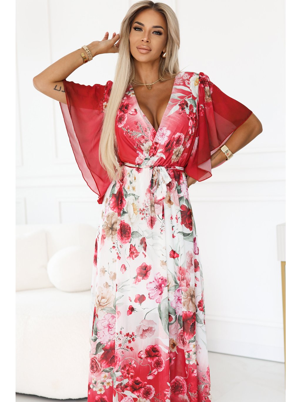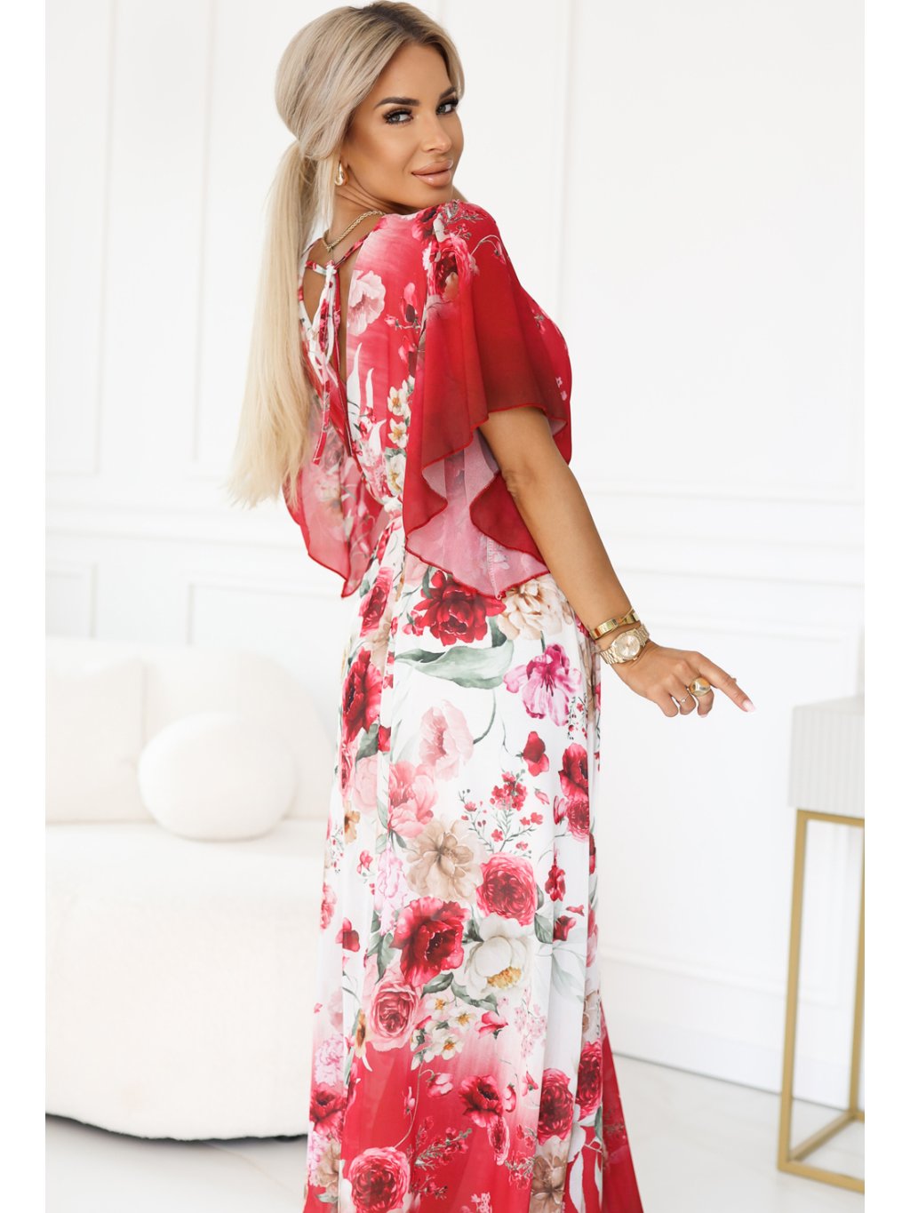 BÍLO-ČERVENÉ VZDUŠNÉ MAXI ŠATY S VÝSTŘIHEM DO V A KVĚTINOVÝM VZOREM