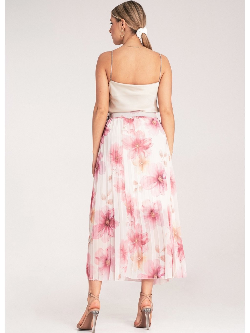 BÍLO-RŮŽOVÁ PLISOVANÁ DÁMSKÁ MIDI SUKNĚ S KVĚTINOVÝM VZOREM