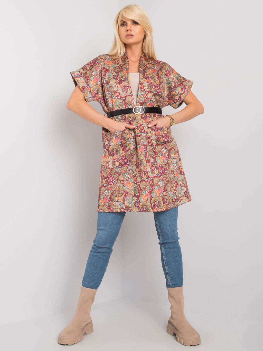 BORDÓ VZOROVANÝ KARDIGAN S KRÁTKÝMI RUKÁVY