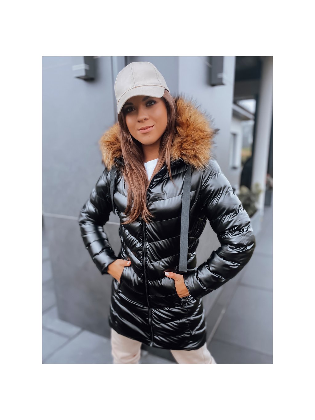 ČERNÁ LESKLÁ BUNDA S KOŽEŠINOVOU KAPUCÍ JASMIN