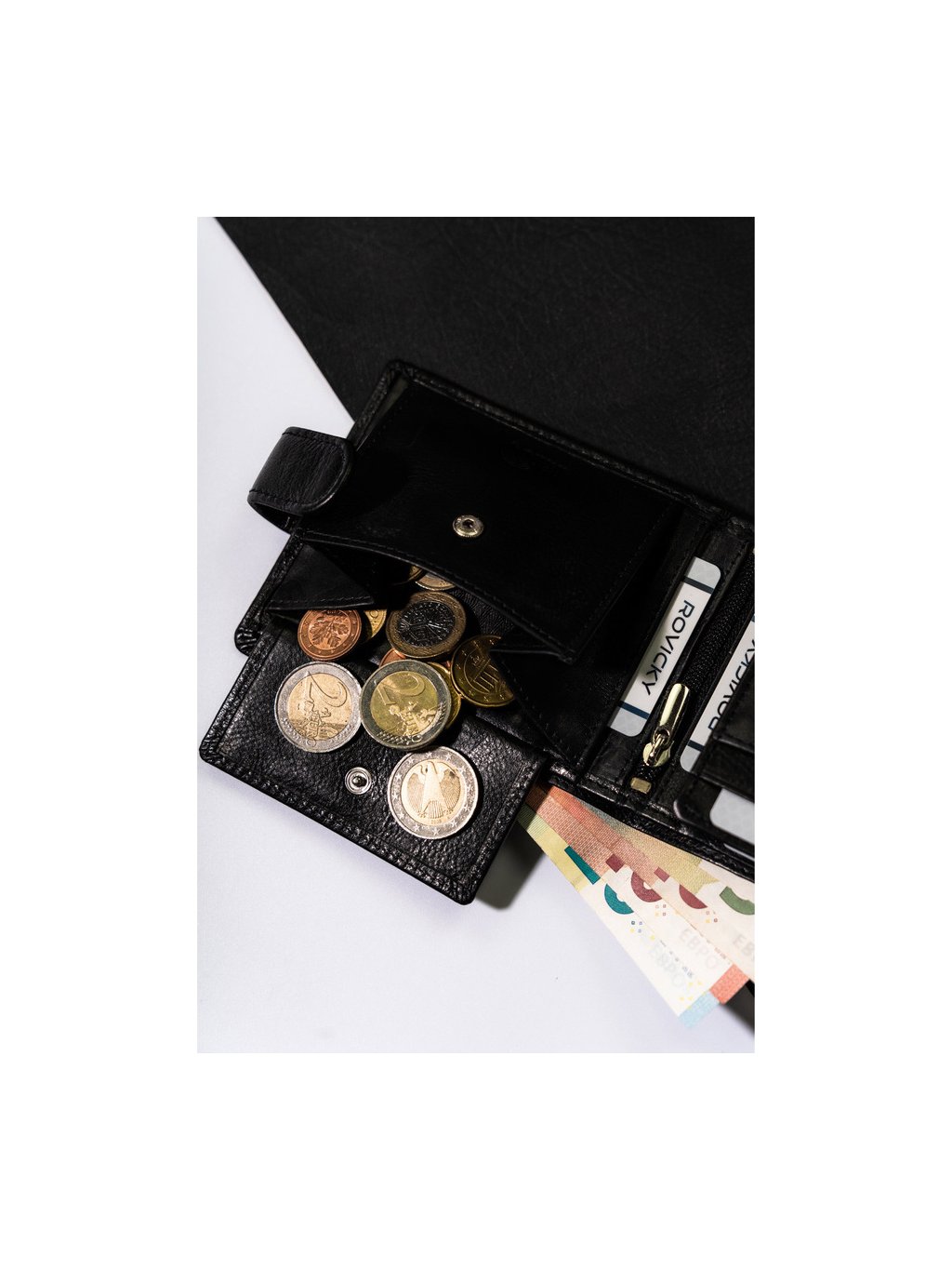 - 1 malá přihrádka na mince se zapínáním na patentku