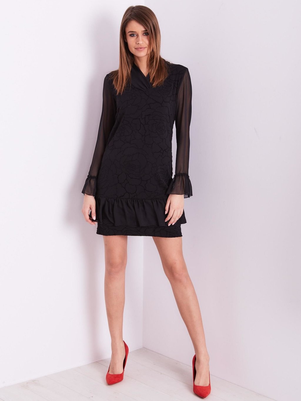 ČERNÉ DÁMSKÉ ŠATY SE VZOREM A VOLÁNKY