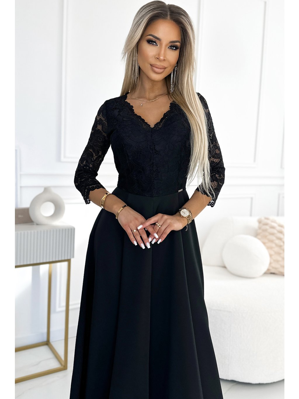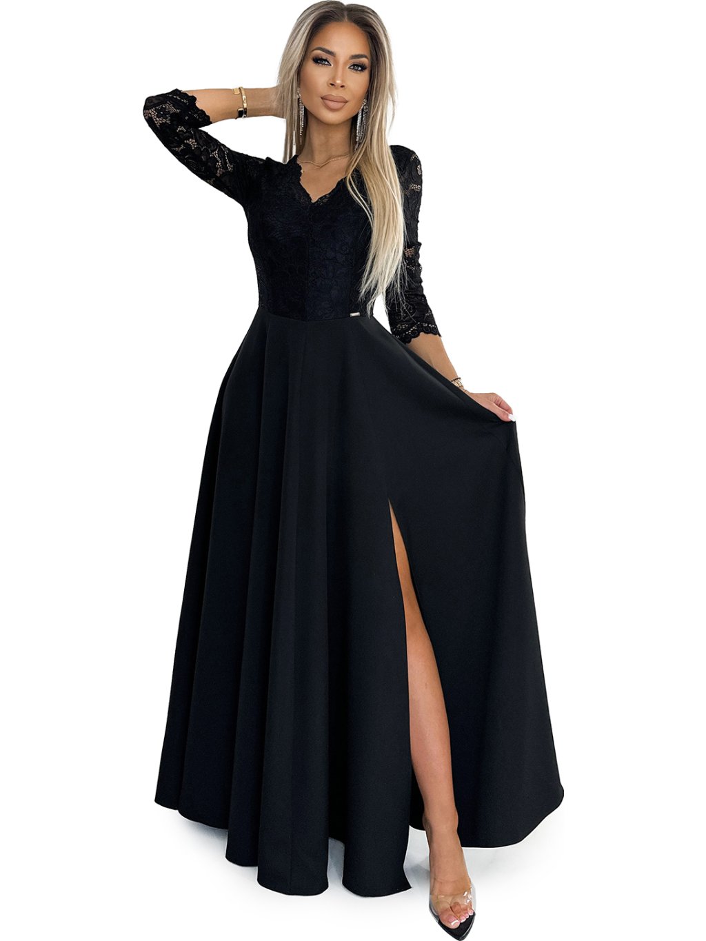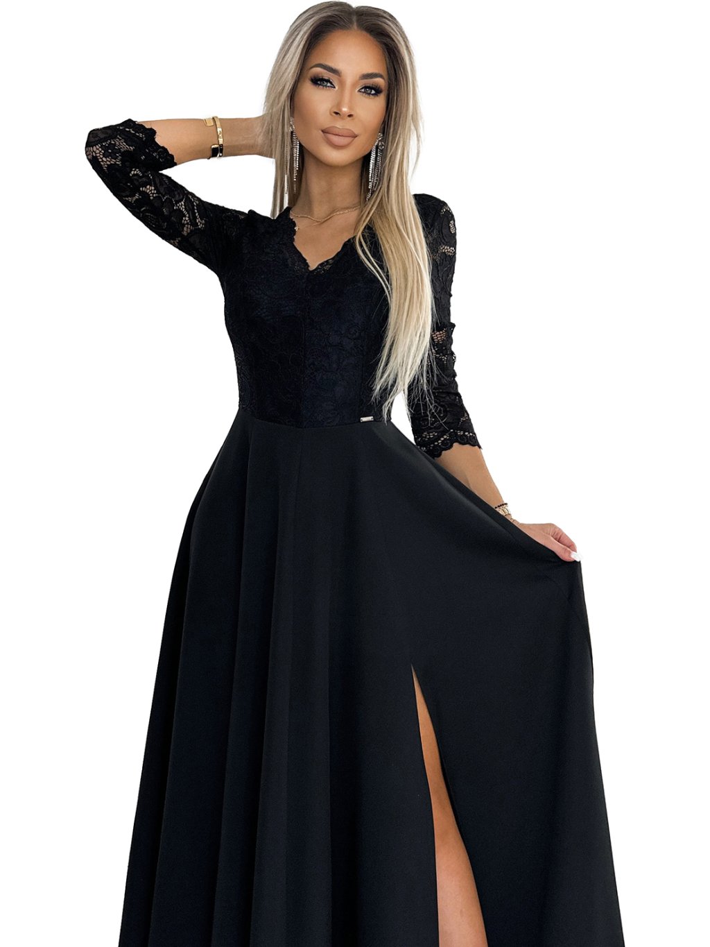 ELEGANTNÍ ČIERNE KRAJKOVÉ DLOUHÉ ŠATY S VÝSTŘIHEM ELISA