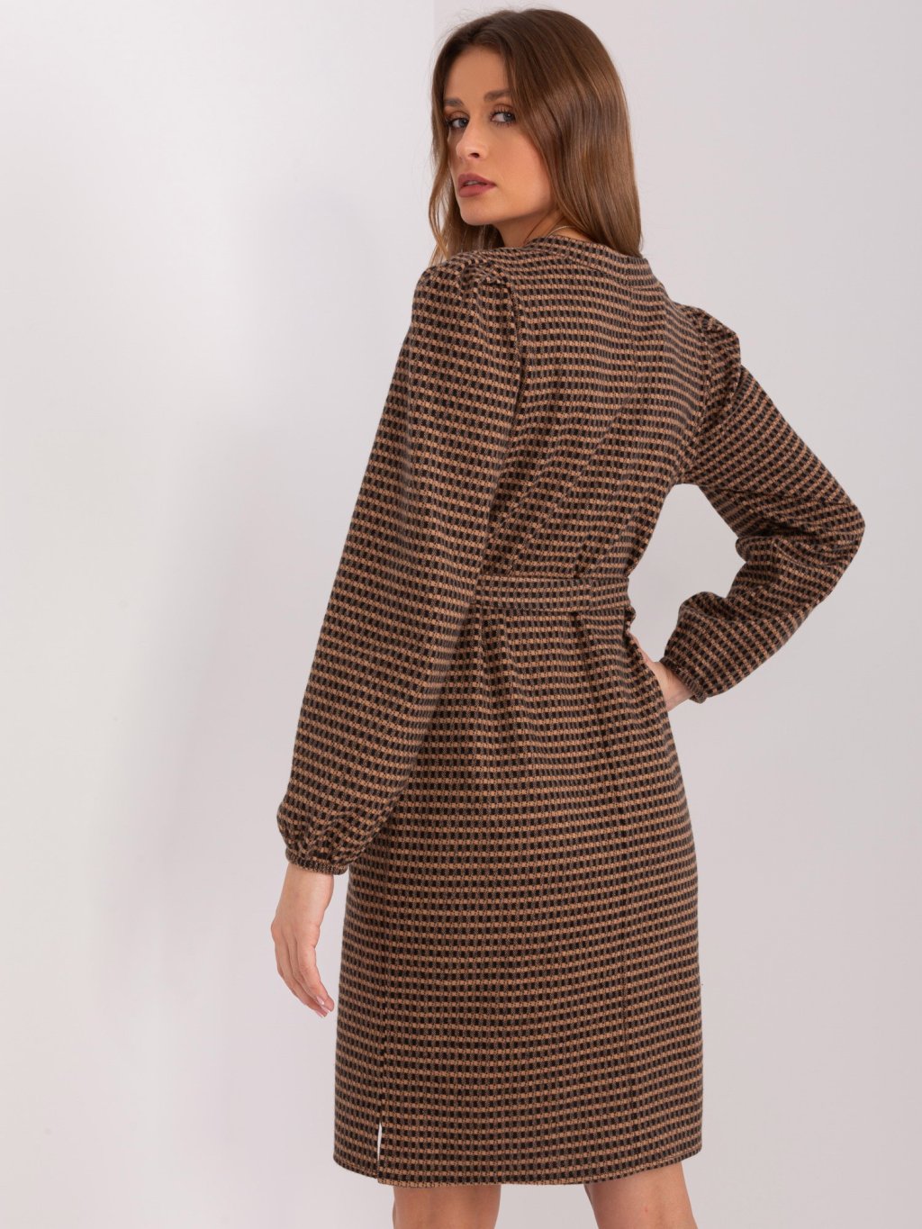 ČERNO-HNĚDÉ VZOROVANÉ MINI ŠATY S PÁSKEM A VÝSTŘIHEM