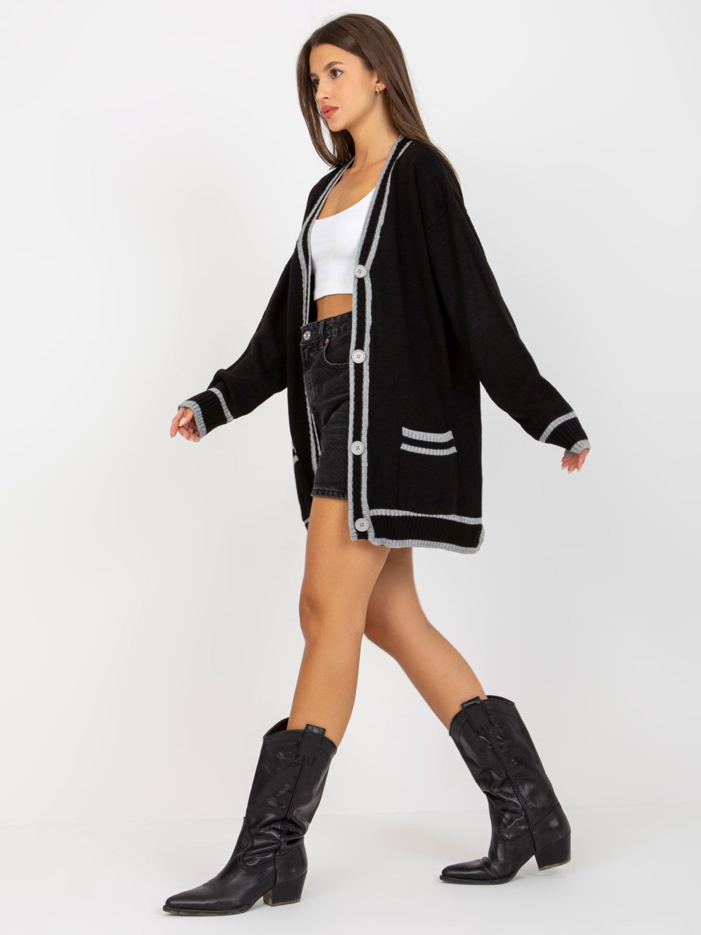 ČERNÝ DLOUHÝ SVETR S KNOFLÍKY A LEMOVÁNÍM