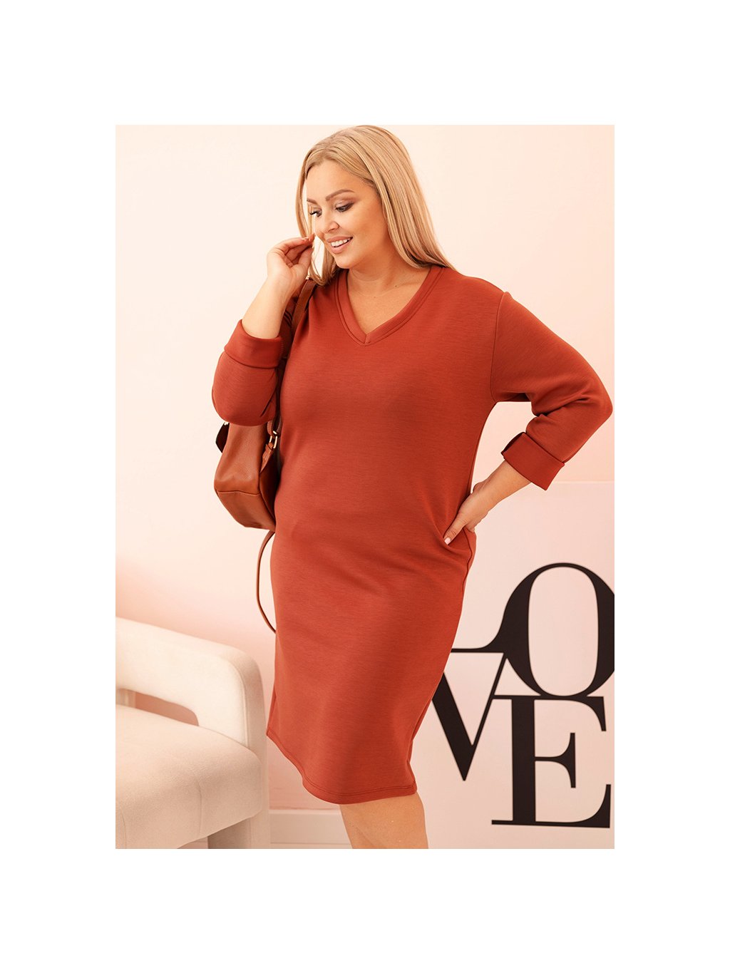 CIHLOVÉ PLUS SIZE ŠATY S VÝSTŘIHEM DO V A 3/4 RUKÁVY