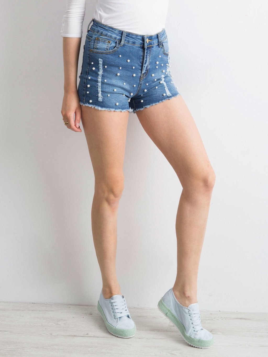 MODRÉ DÁMSKÉ DŽÍNOVÉ ŠORTKY S PERLIČKAMI