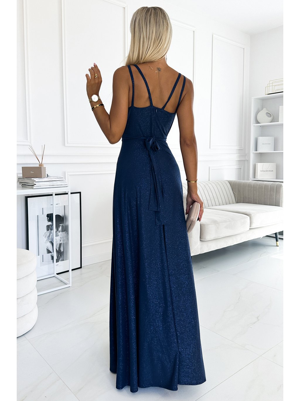 DLOUHÉ TMAVĚ MODRÉ TŘPYTIVÉ ŠATY S VÝSTŘIHEM A DVOJITÝMI RAMÍNKY