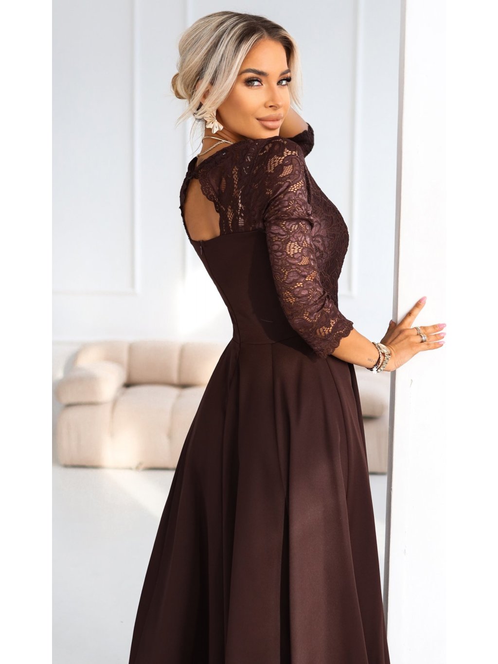 ELEGANTNÍ ČOKOLÁDOVĚ HNĚDÉ KRAJKOVÉ DLOUHÉ ŠATY S VÝSTŘIHEM ELISA