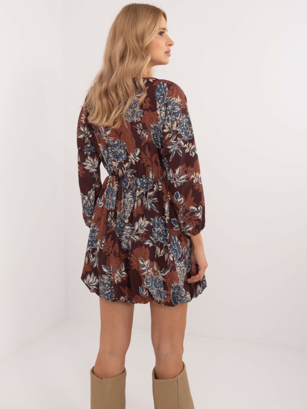 HNĚDÉ DÁMSKÉ VZOROVANÉ MINI ŠATY S VÝSTŘIHEM DO V