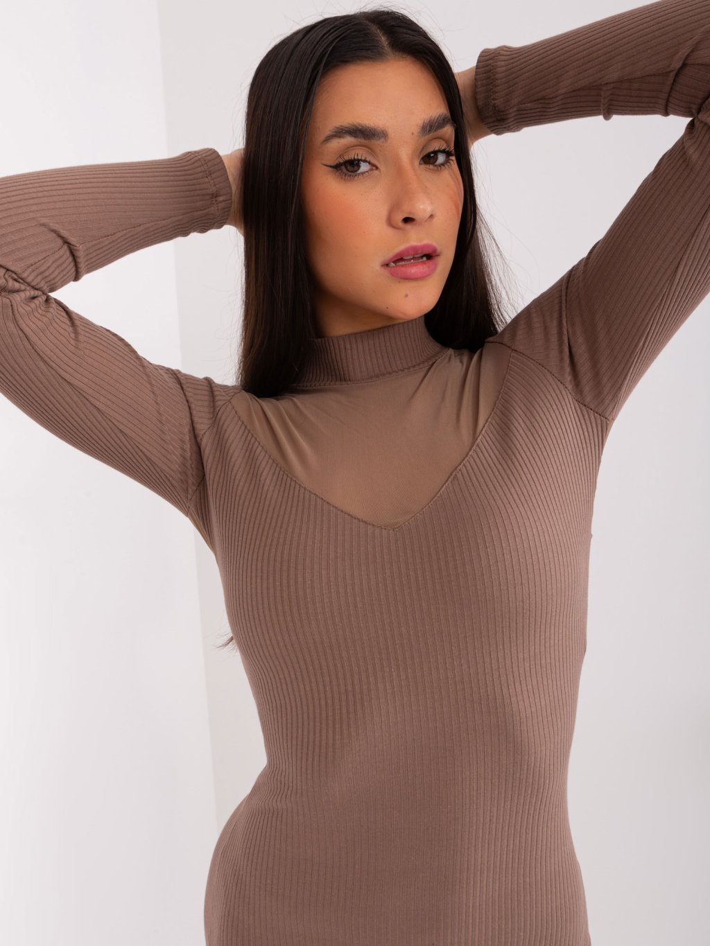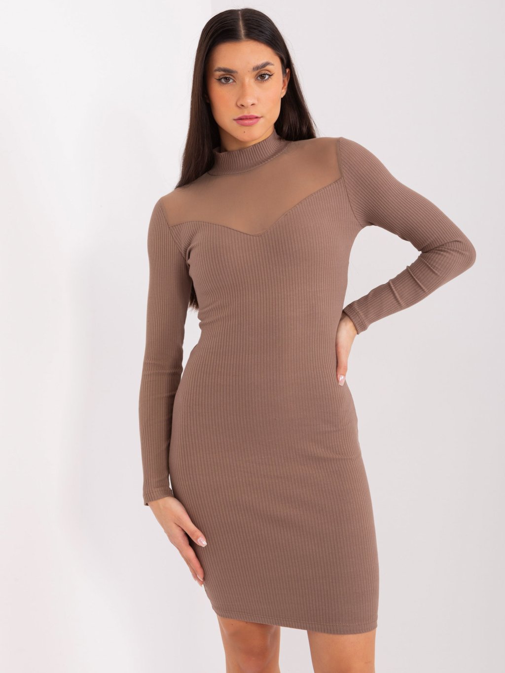 HNĚDÉ MINI ŠATY S PRŮSVITNÝM VÝSTŘIHEM A ZÁDY