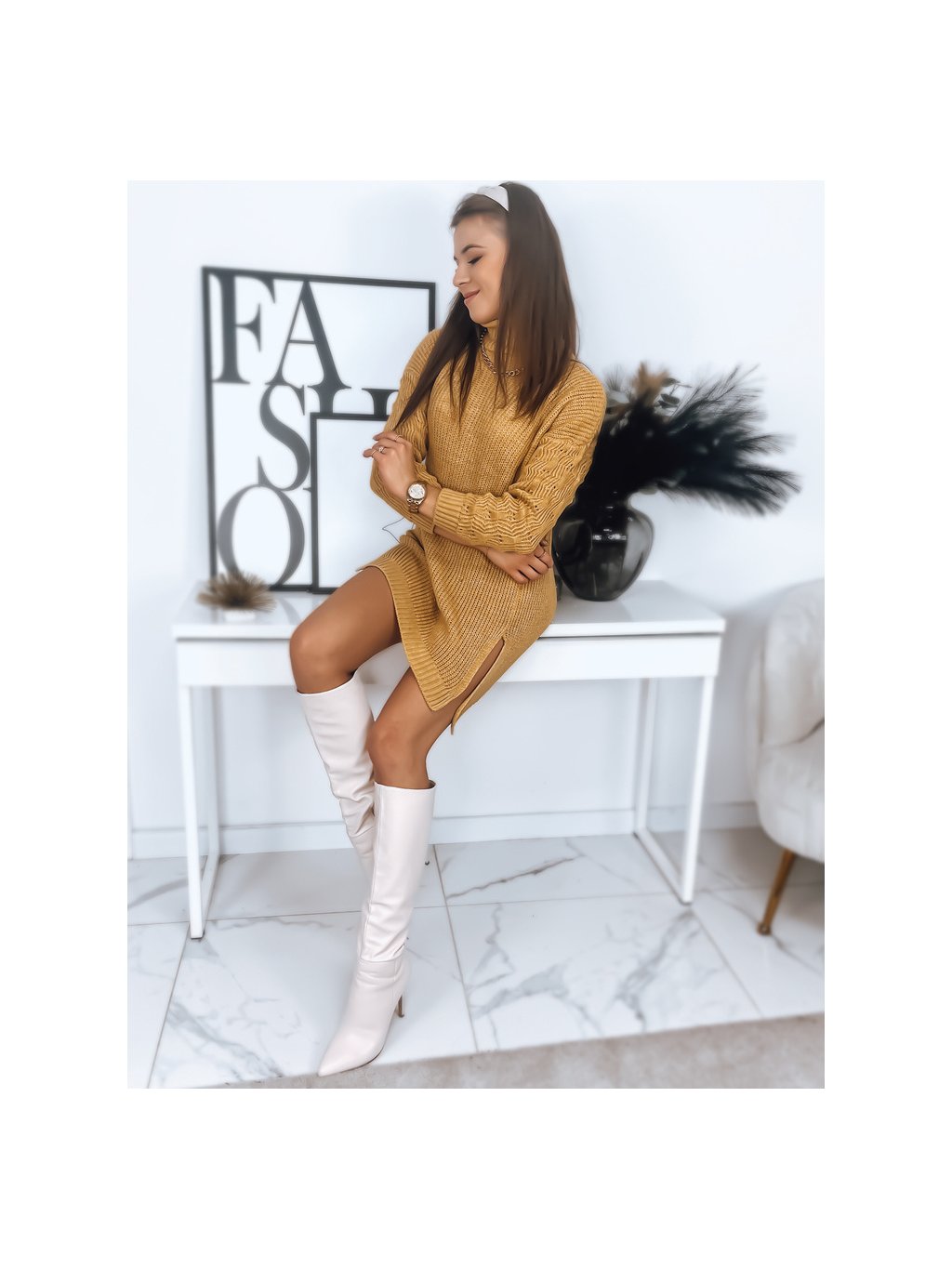 HOŘČICOVÉ PLETENÉ ŠATY FUERTA SE VZOROVANÝMI RUKÁVY