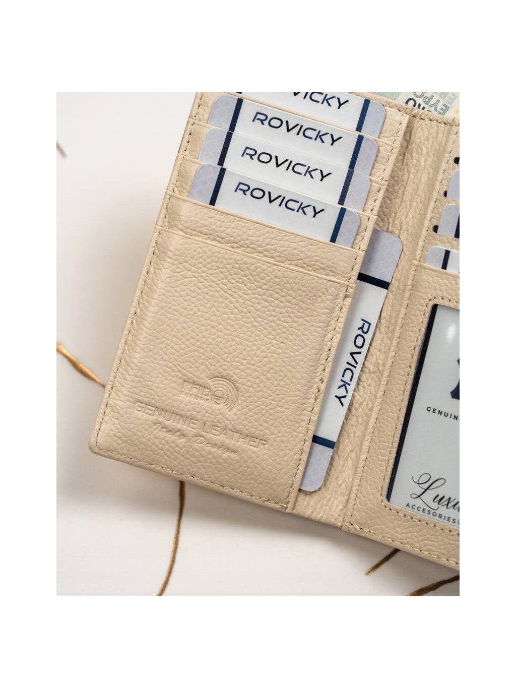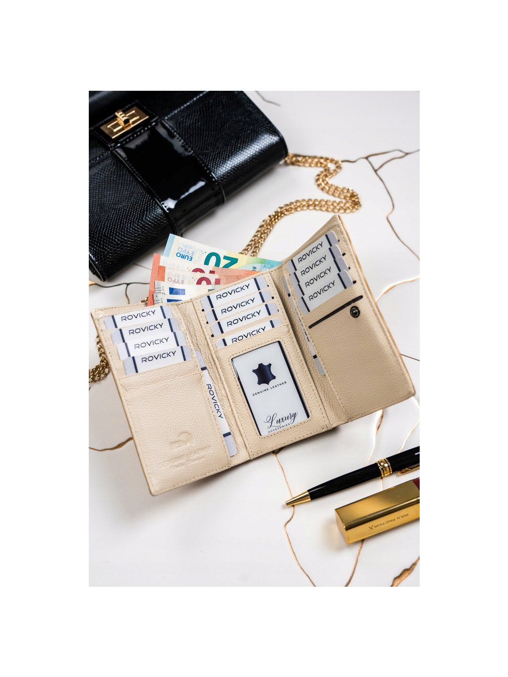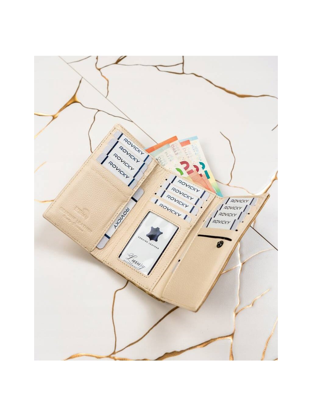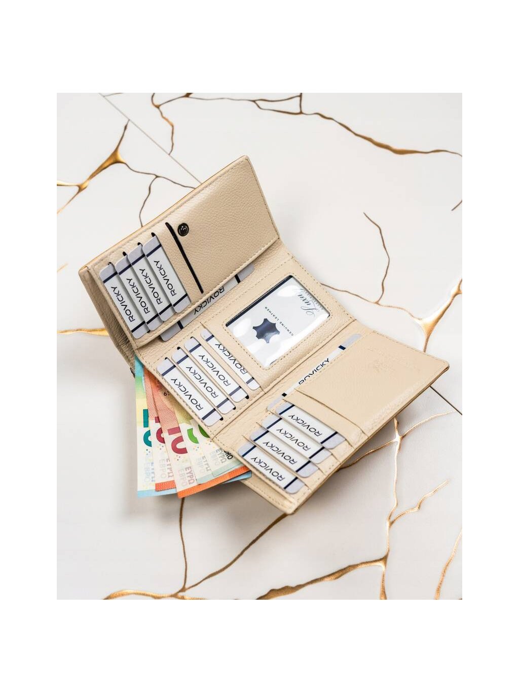 - 2 široké přihrádky na bankovky po celé délce peněženky