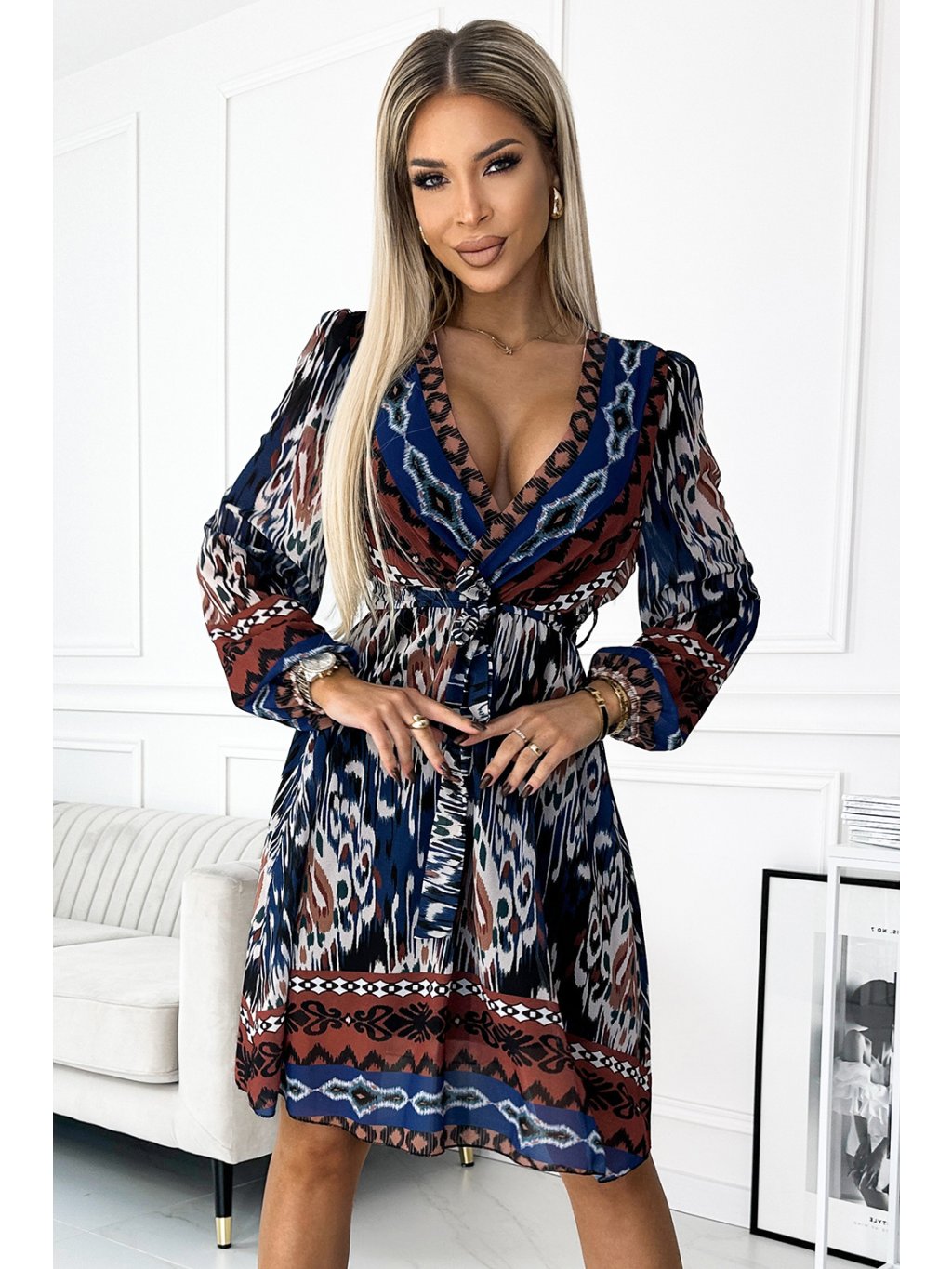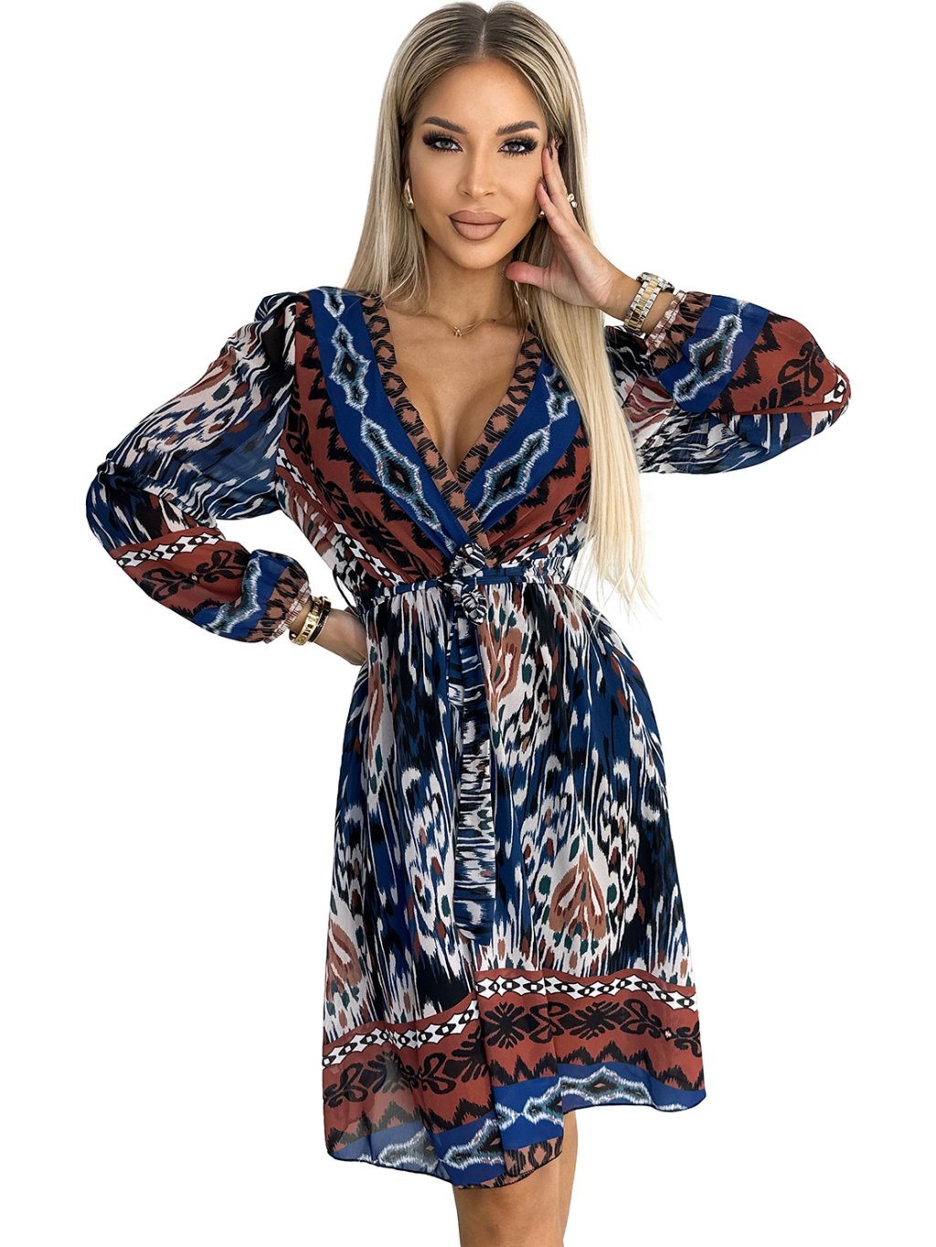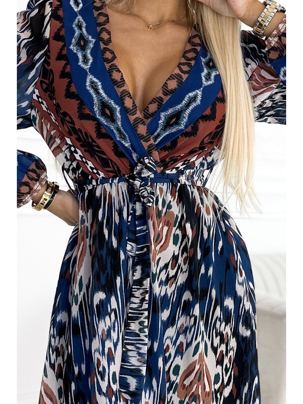 MODRO-HNĚDÉ ŠIFONOVÉ ŠATY S ETNICKÝM VZOREM