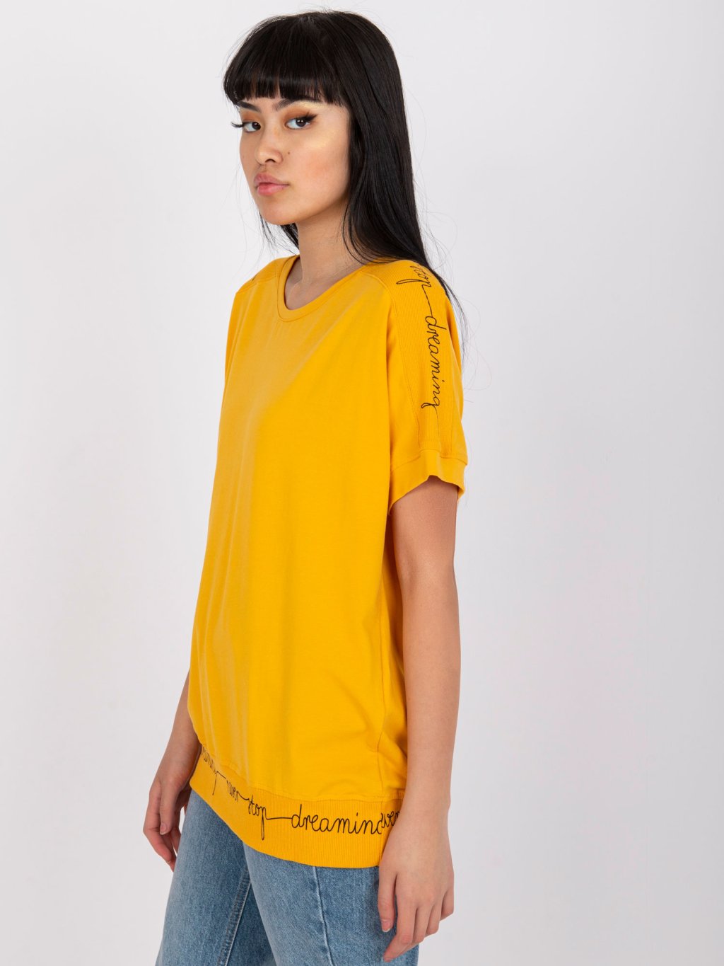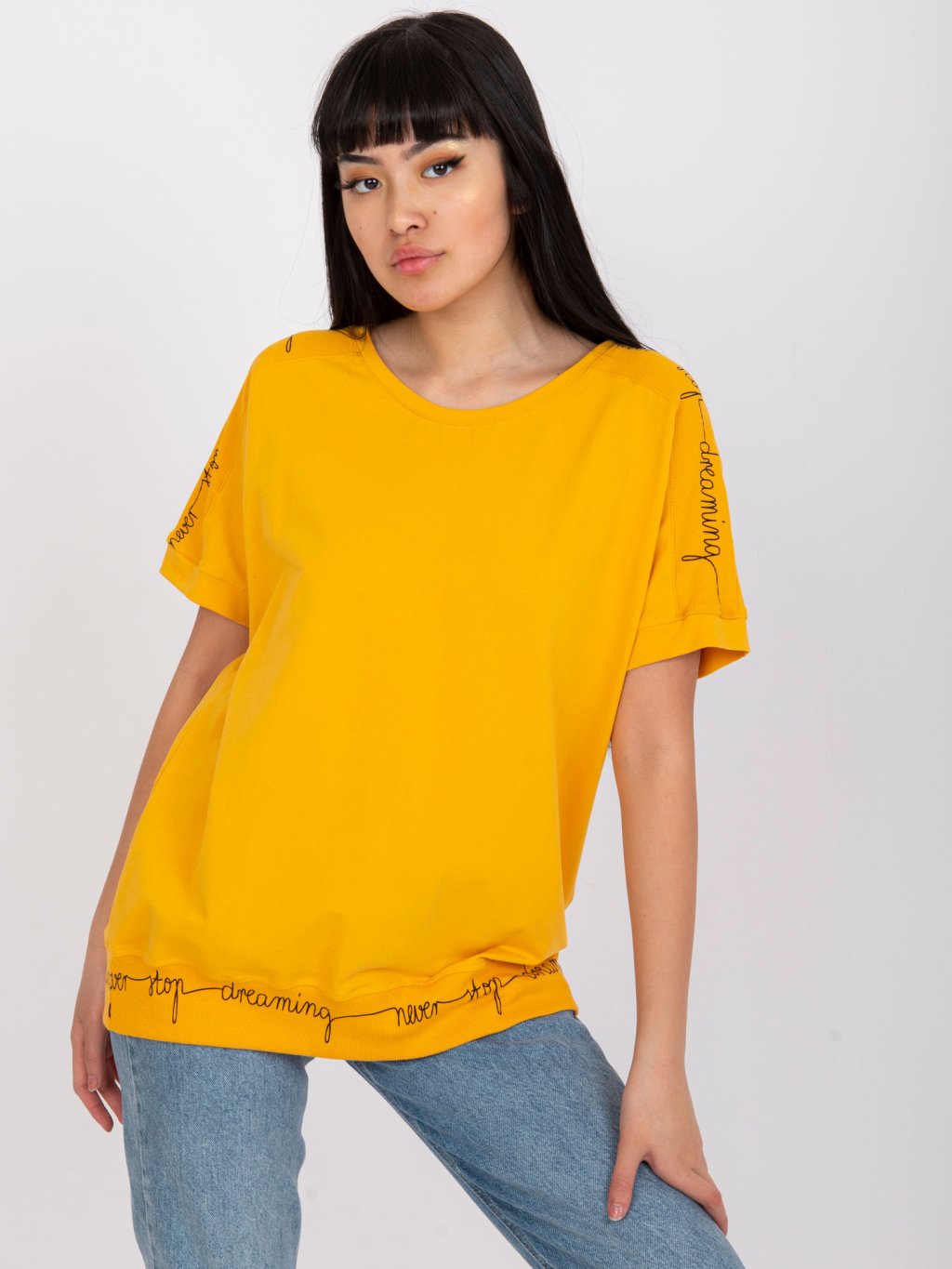 ORANŽOVÉ DÁMSKÉ TRIČKO S NÁPISY NA RUKÁVECH