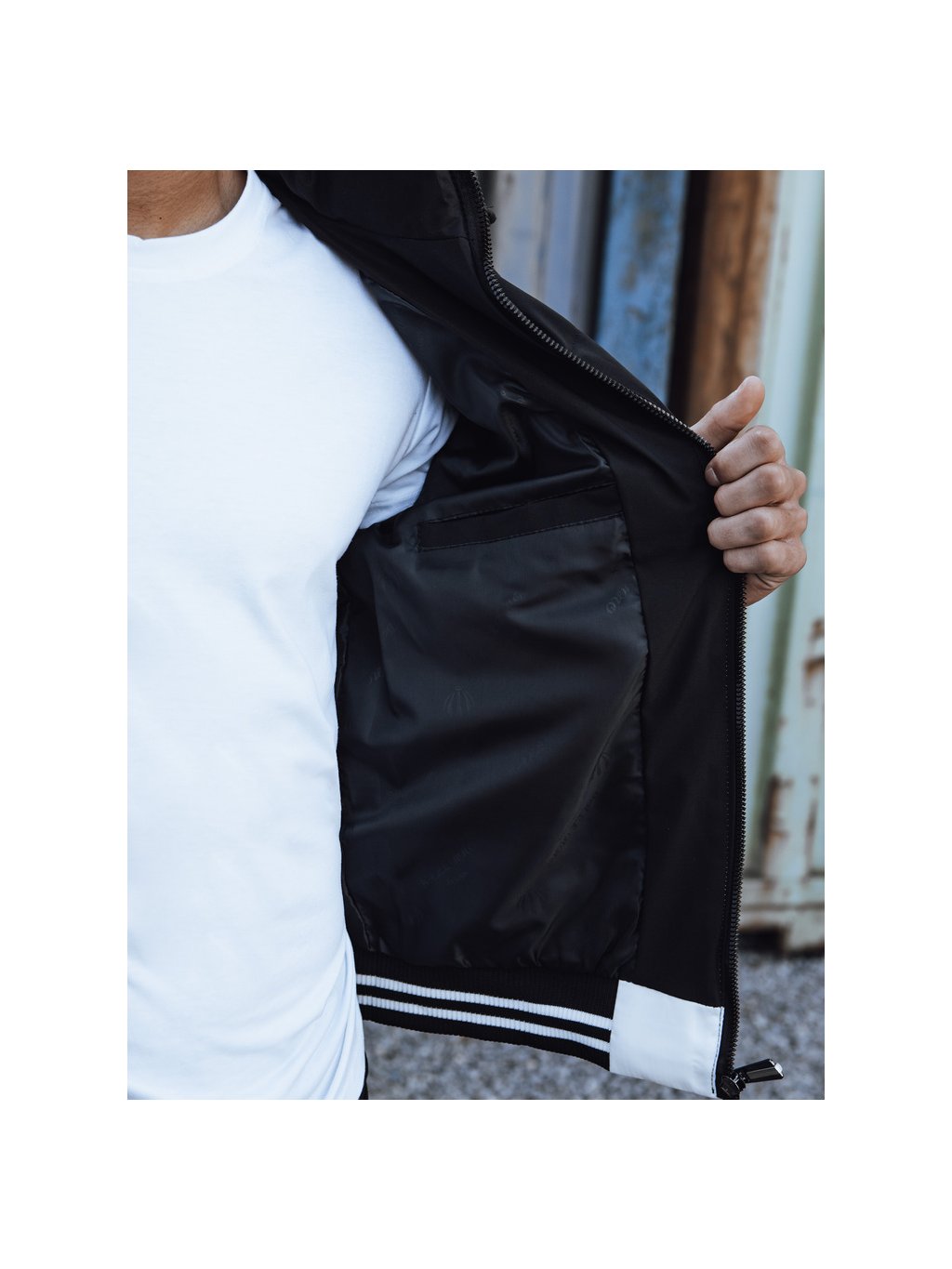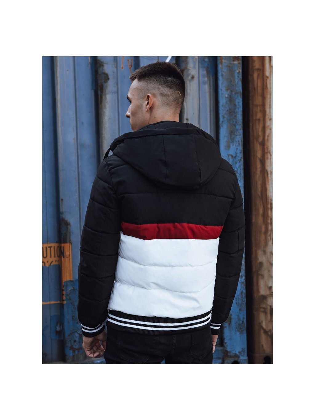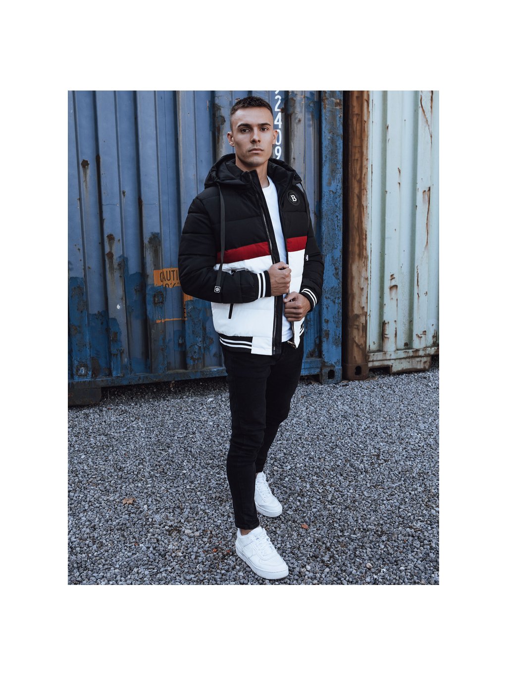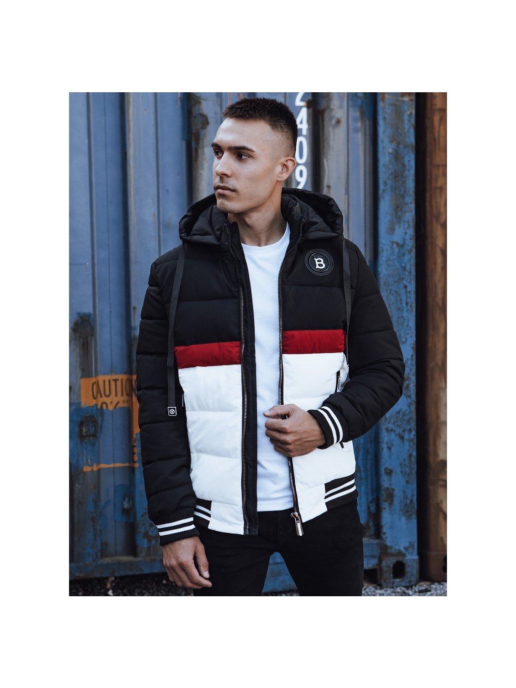 PÁNSKÁ BÍLO-ČERNÁ ZIMNÍ PROŠÍVANÁ BUNDA S KAPUCÍ