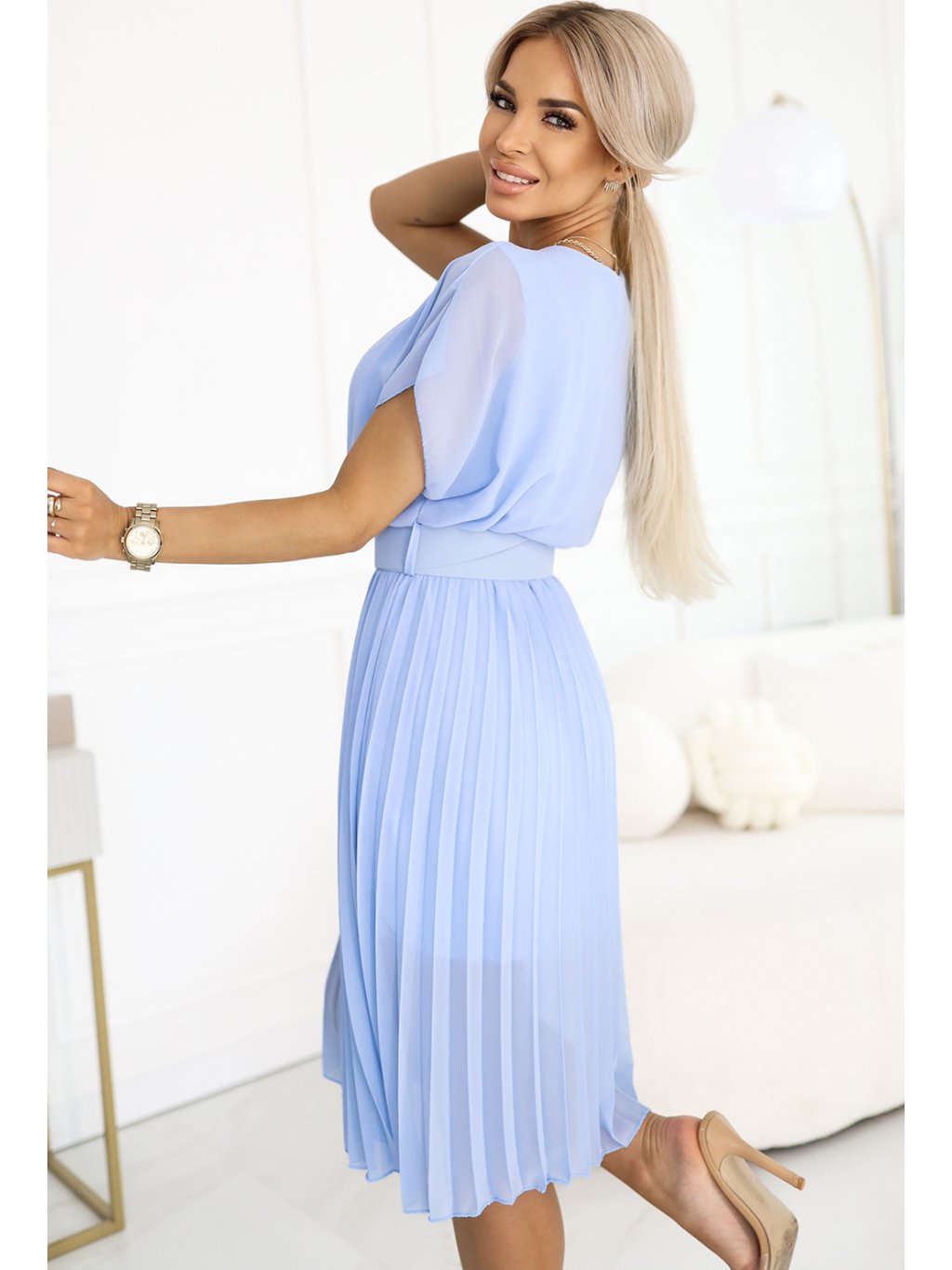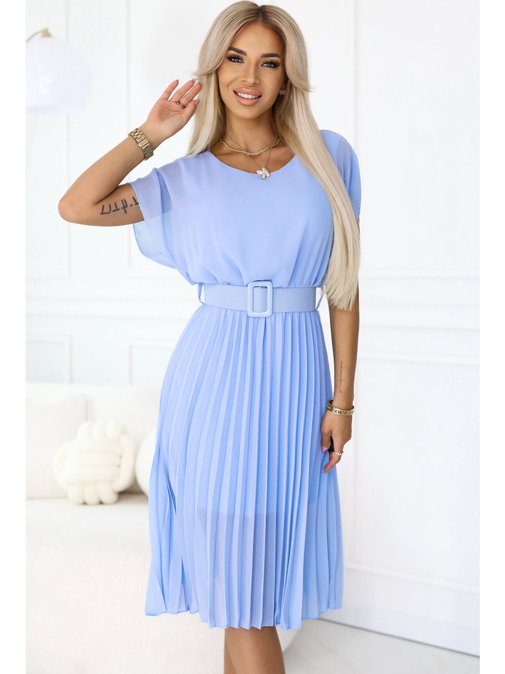 PLISOVANÉ SVĚTLE MODRÉ MIDI ŠATY SE ŠIROKÝM PÁSKEM JULIA