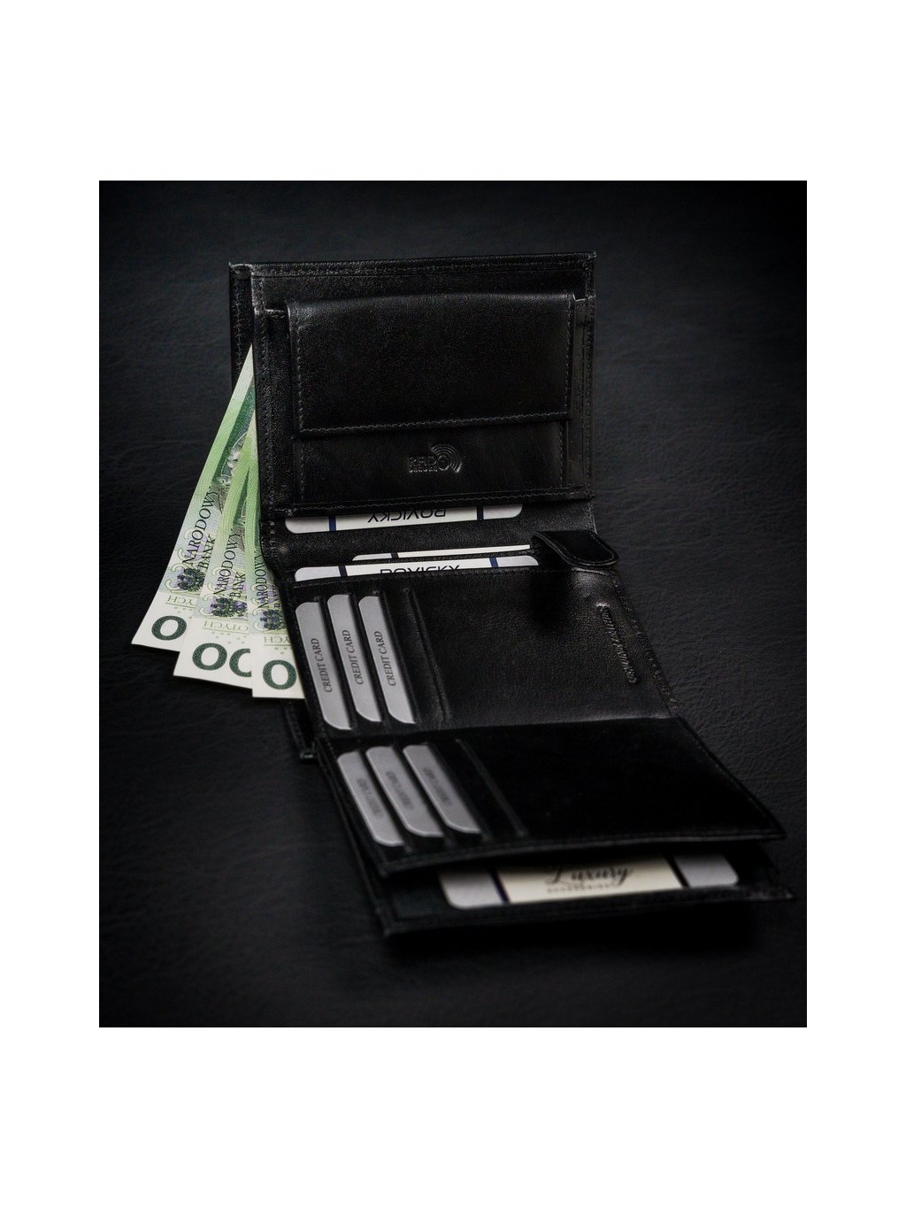 - uvnitř je kapsa na mince, 2 přihrádky na bankovky, 11 míst na karty, 6 míst na větší doklady