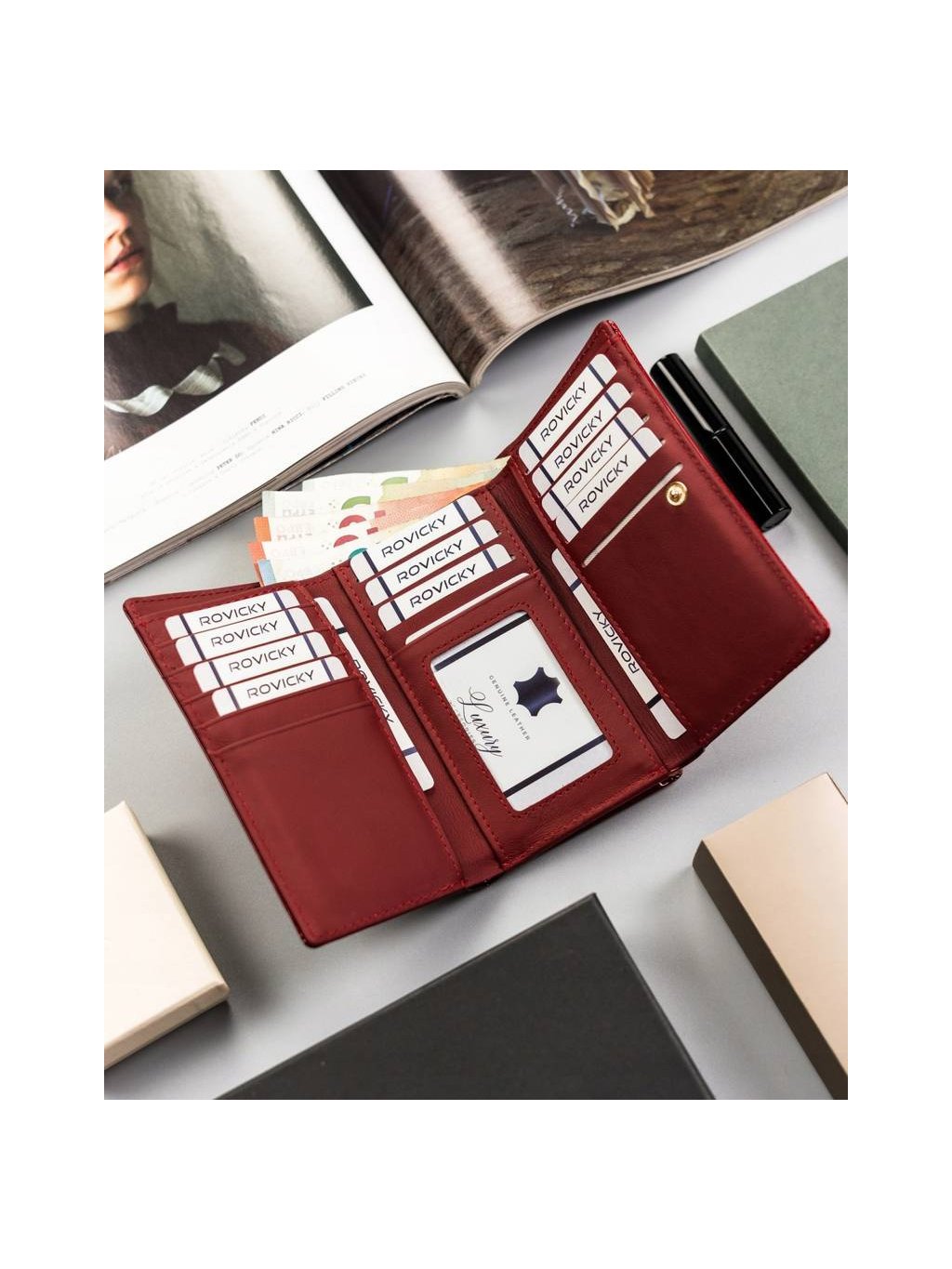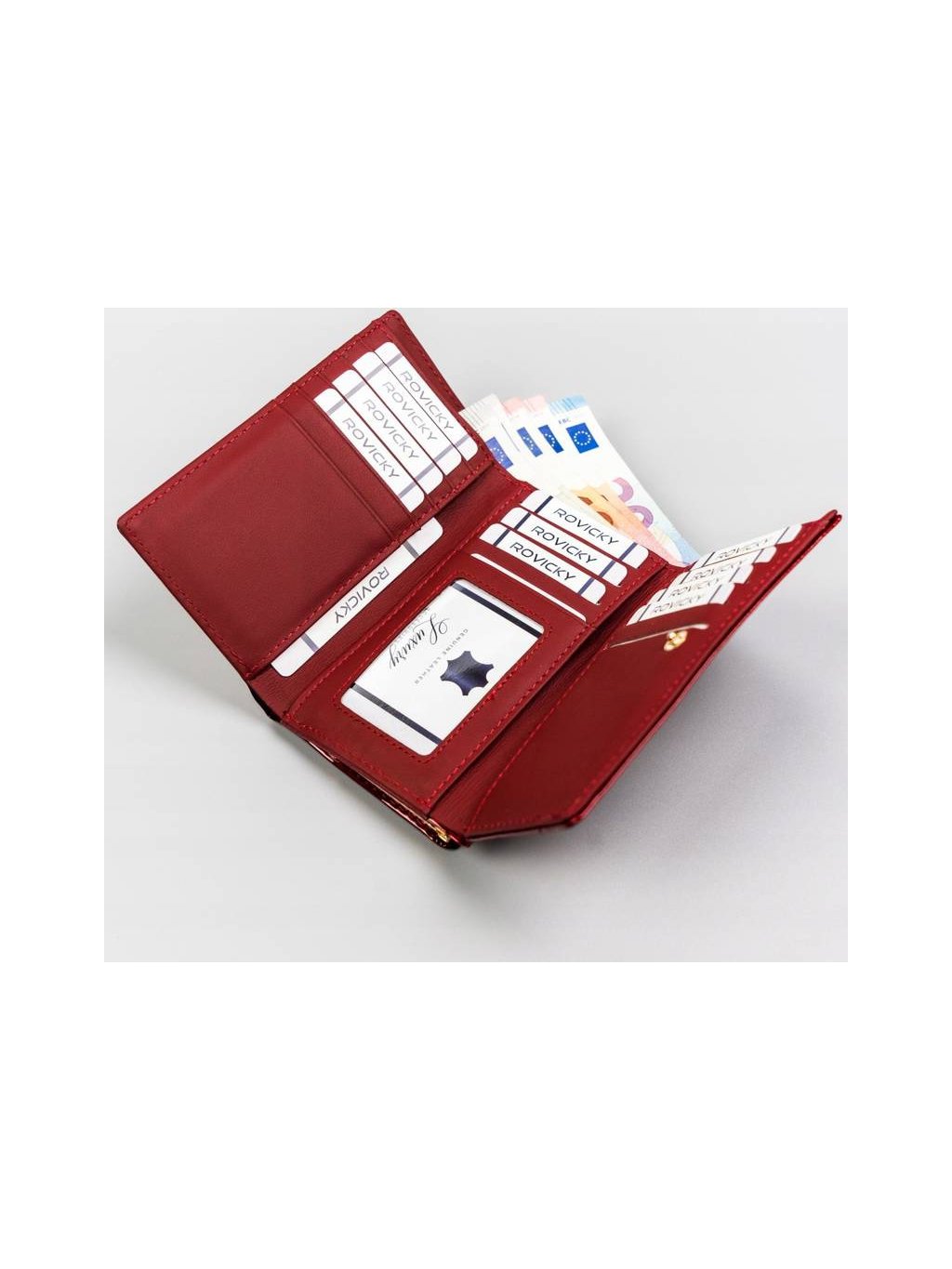 - Dvě kapsy na bankovky, z nichž jedna je otevřená, druhá na zip.