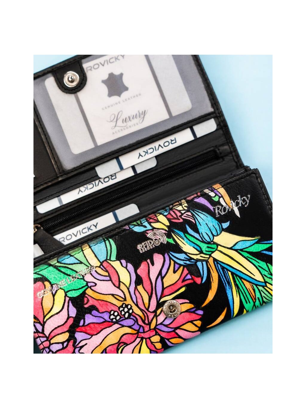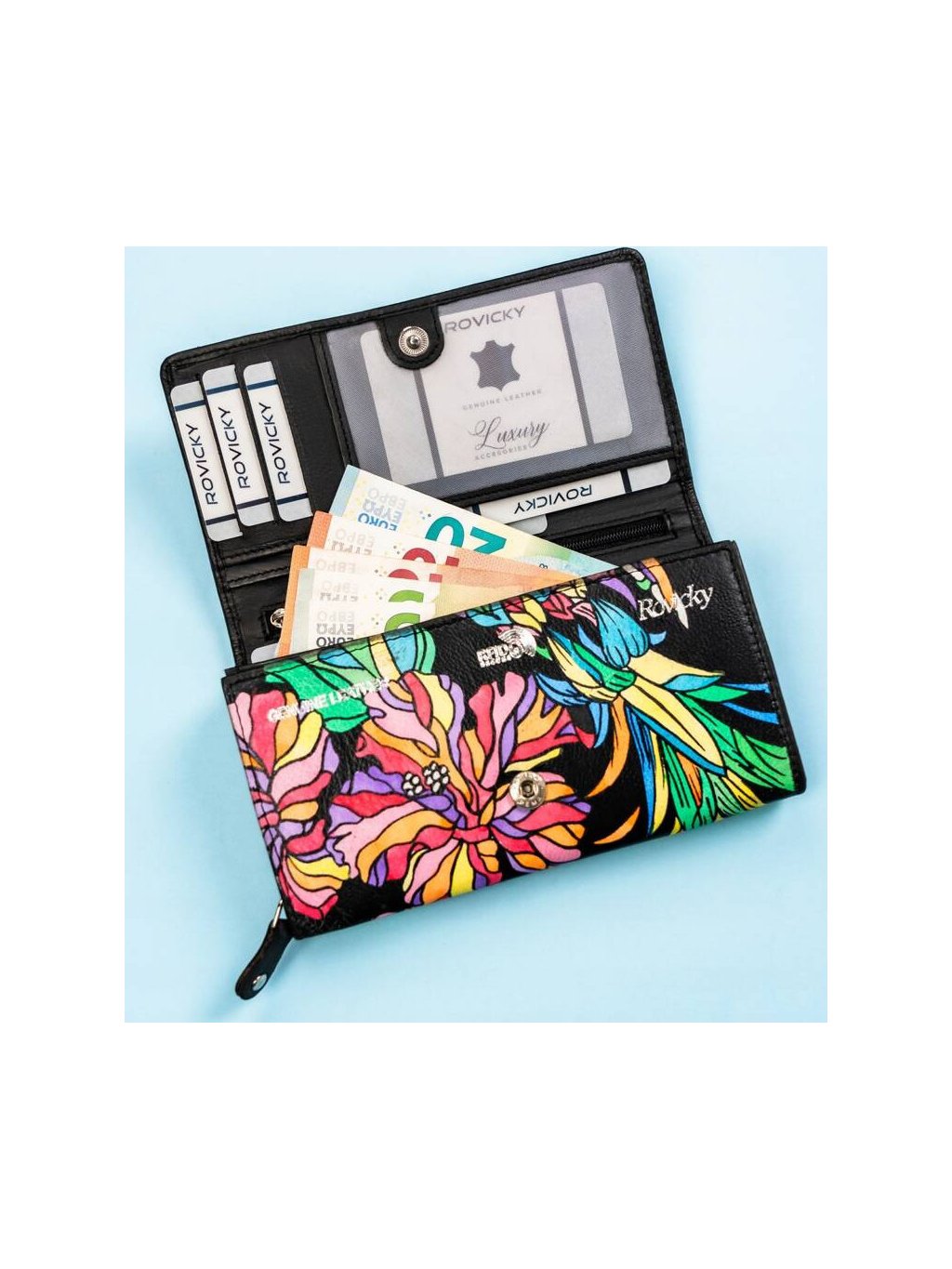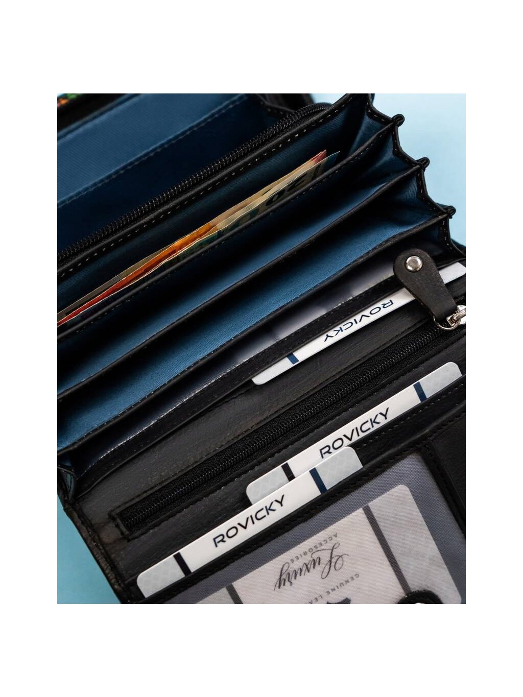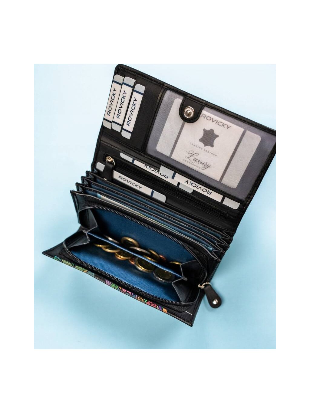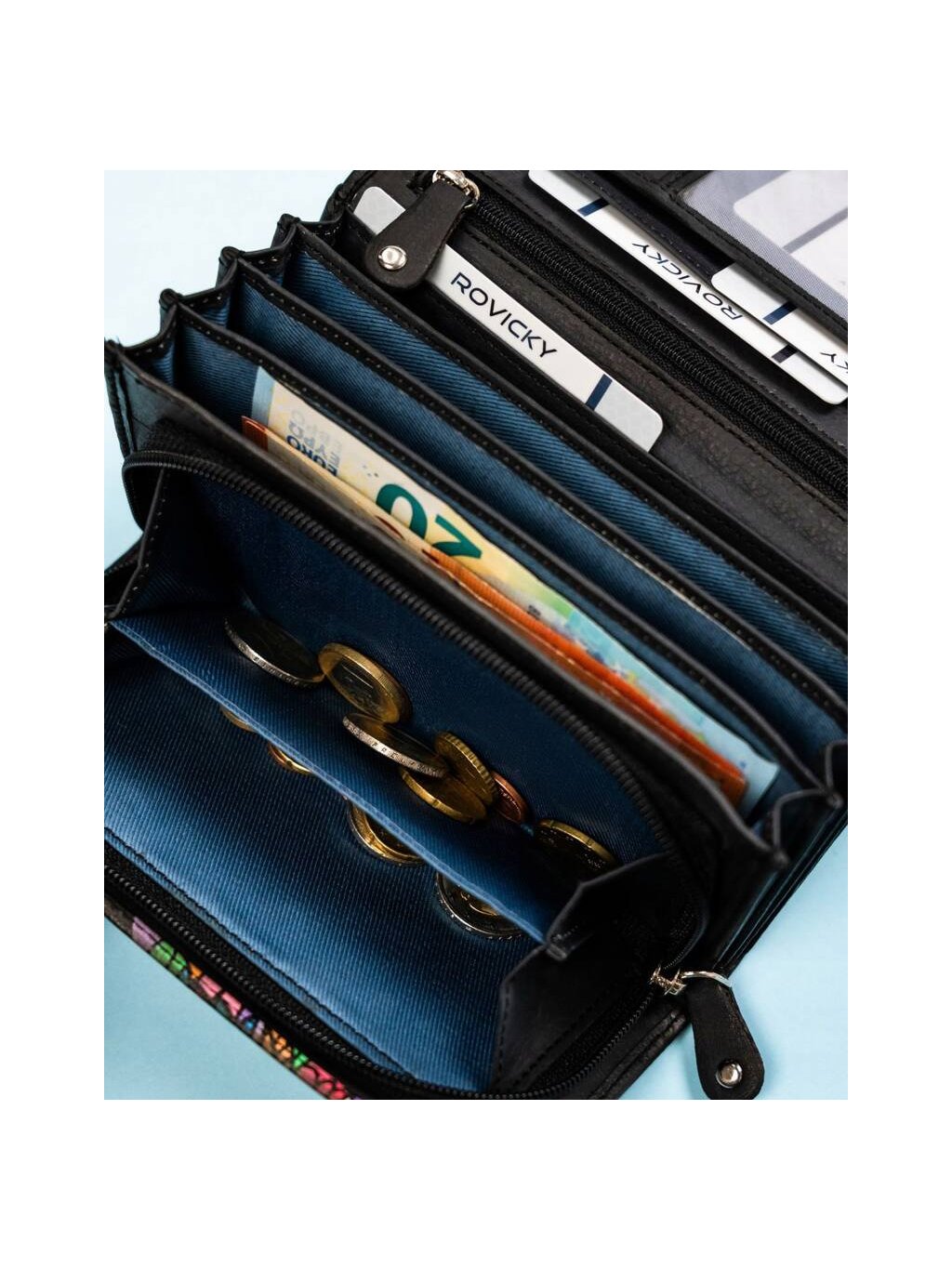 - 5 prostorných kapes na větší dokumenty: 3 vnitřní otevřené, 1 vnitřní uzavíratelná na zip, 1 externí umístěná na zadní straně peněženky