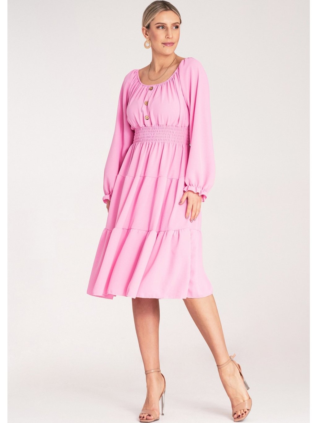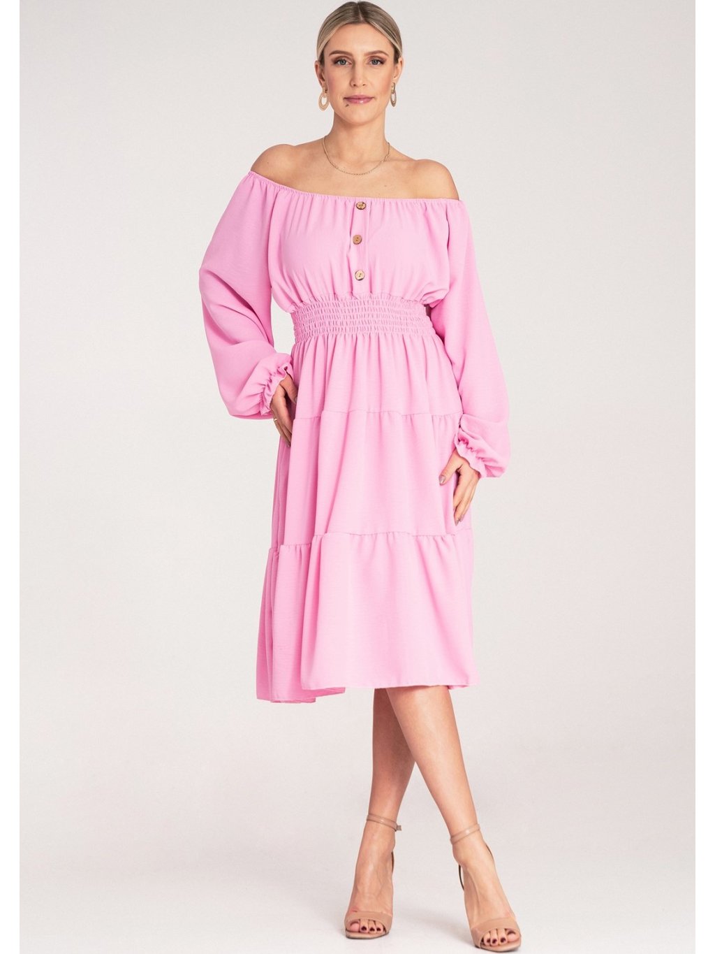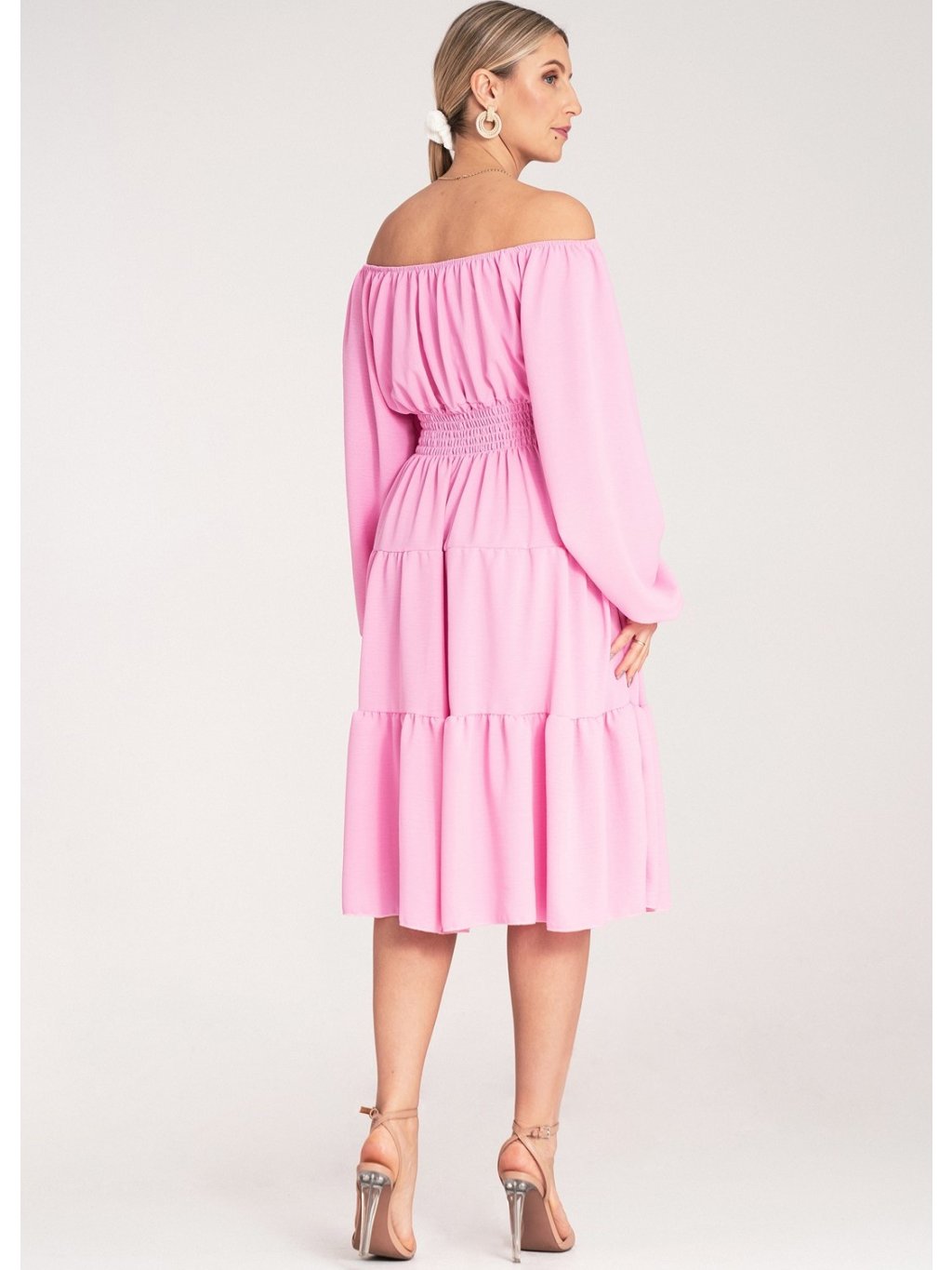 RŮŽOVÉ DÁMSKÉ MIDI ŠATY S ODHALENÝMI RAMENY
