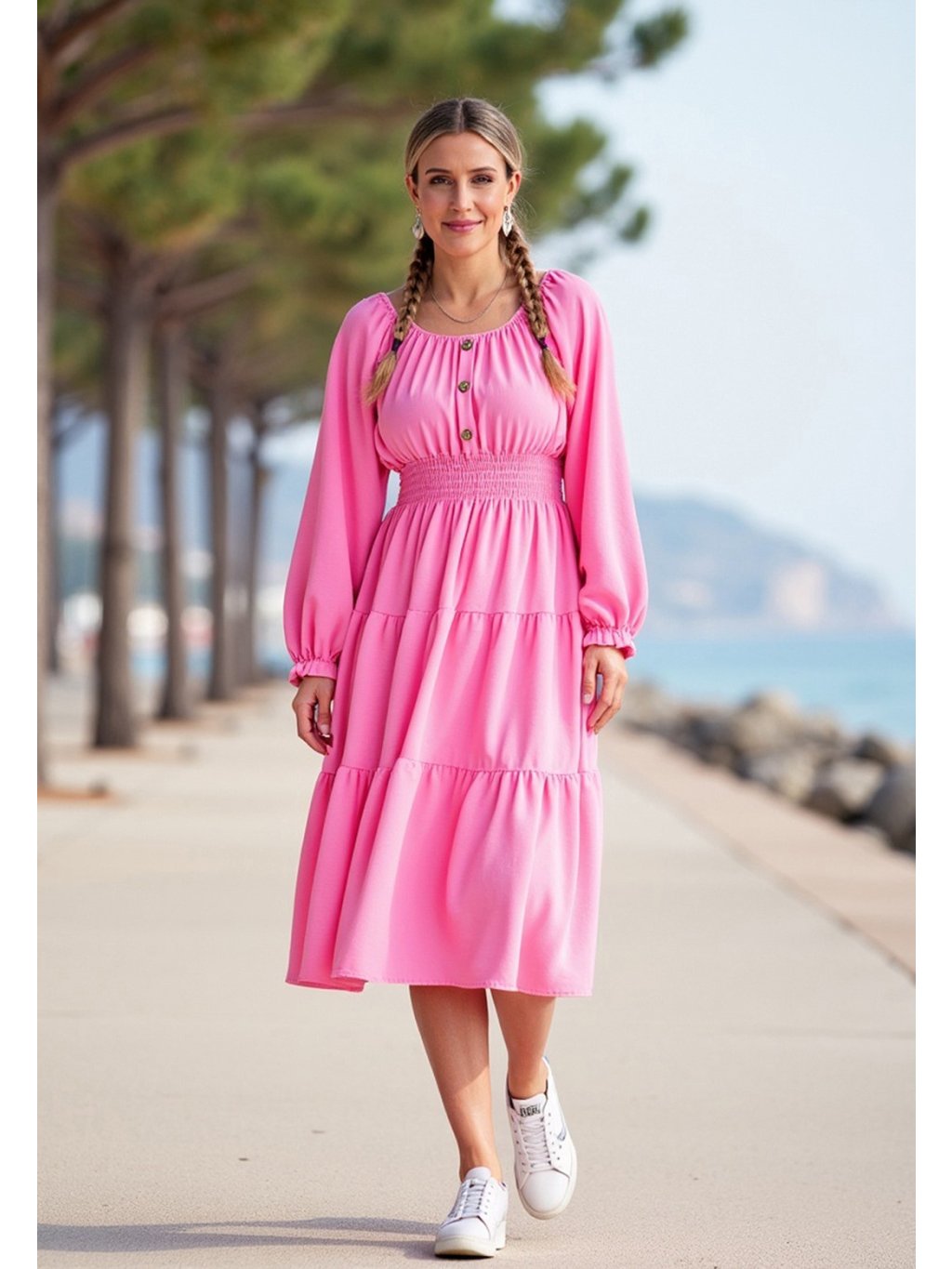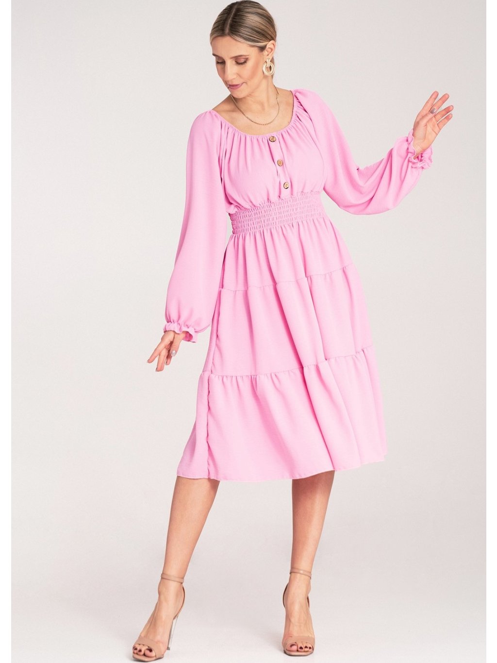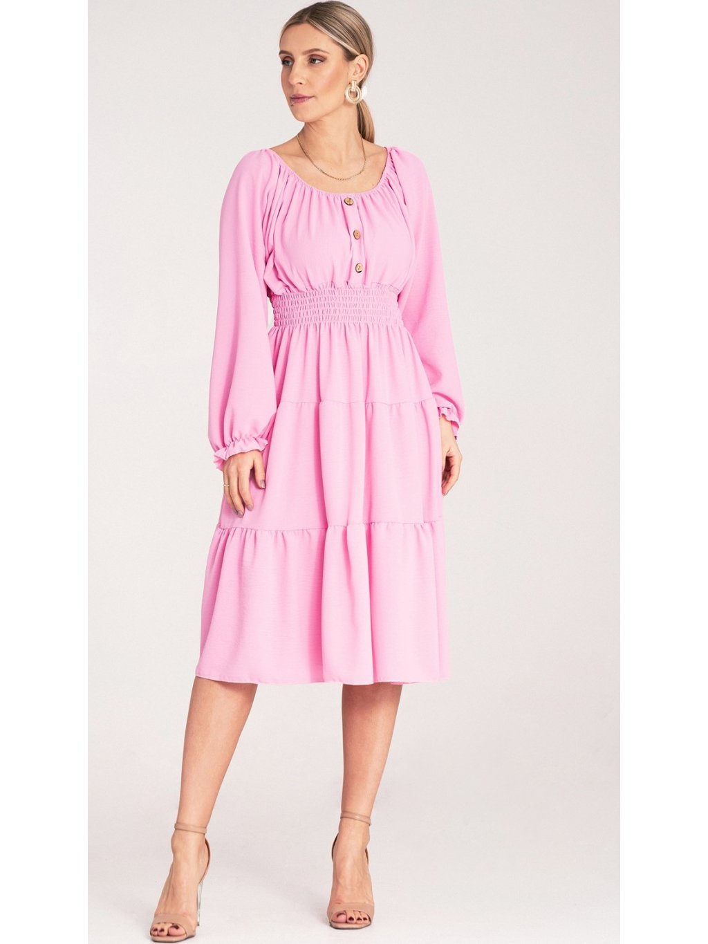RŮŽOVÉ DÁMSKÉ MIDI ŠATY S ODHALENÝMI RAMENY