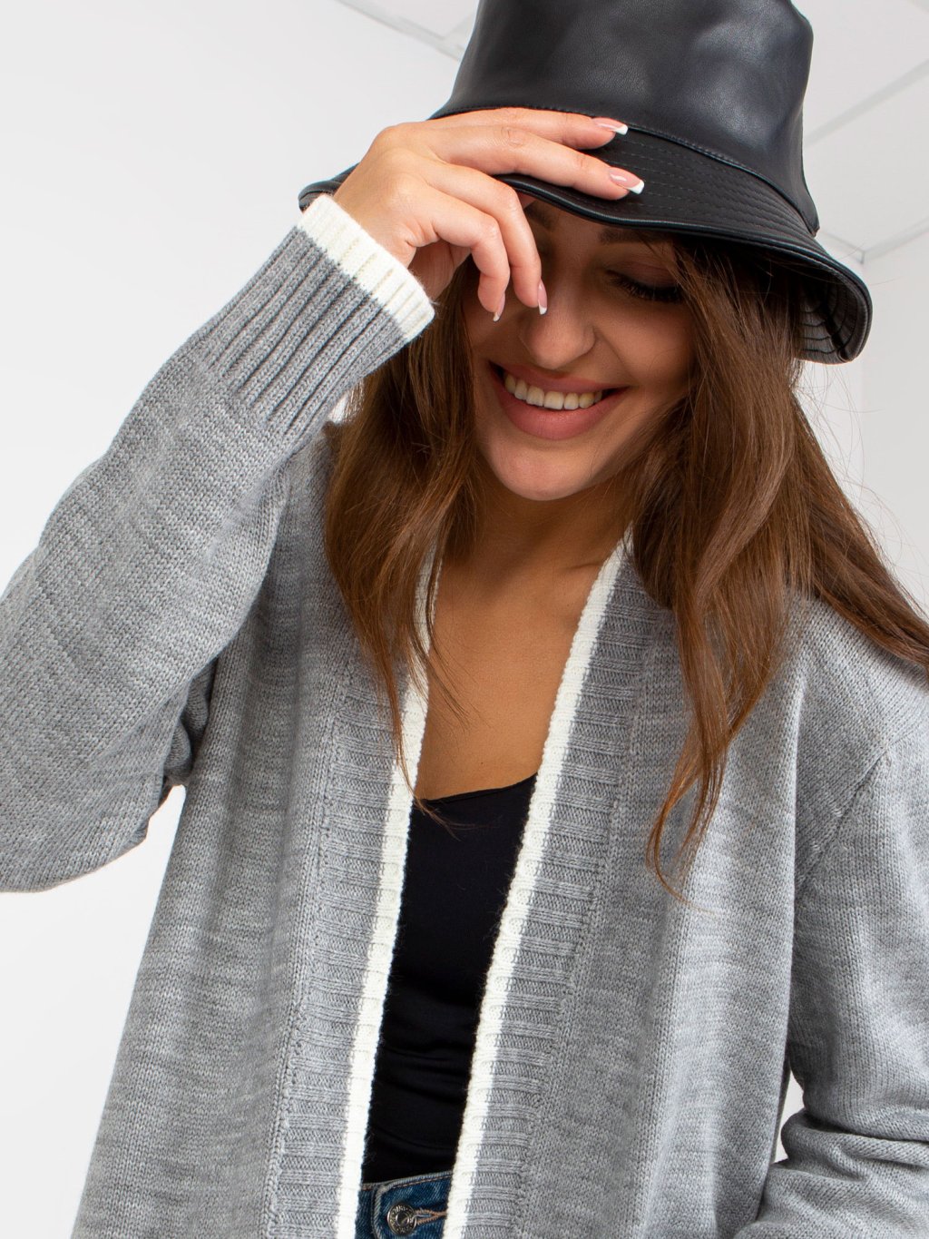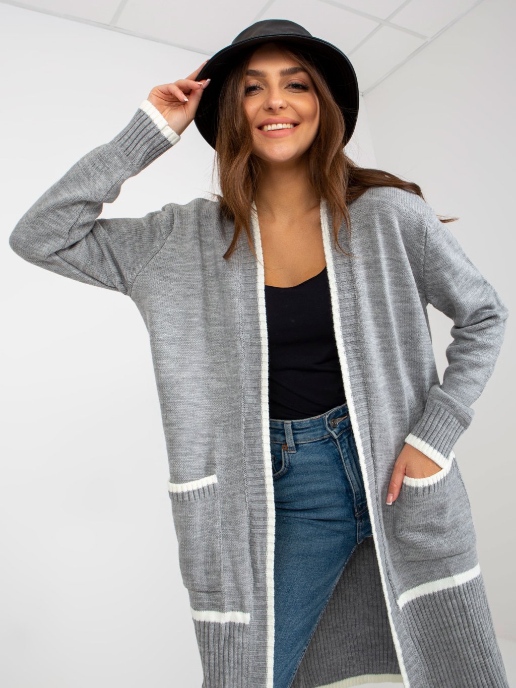 ŠEDÝ KARDIGAN S LEMOVÁNÍM A KAPSAMI