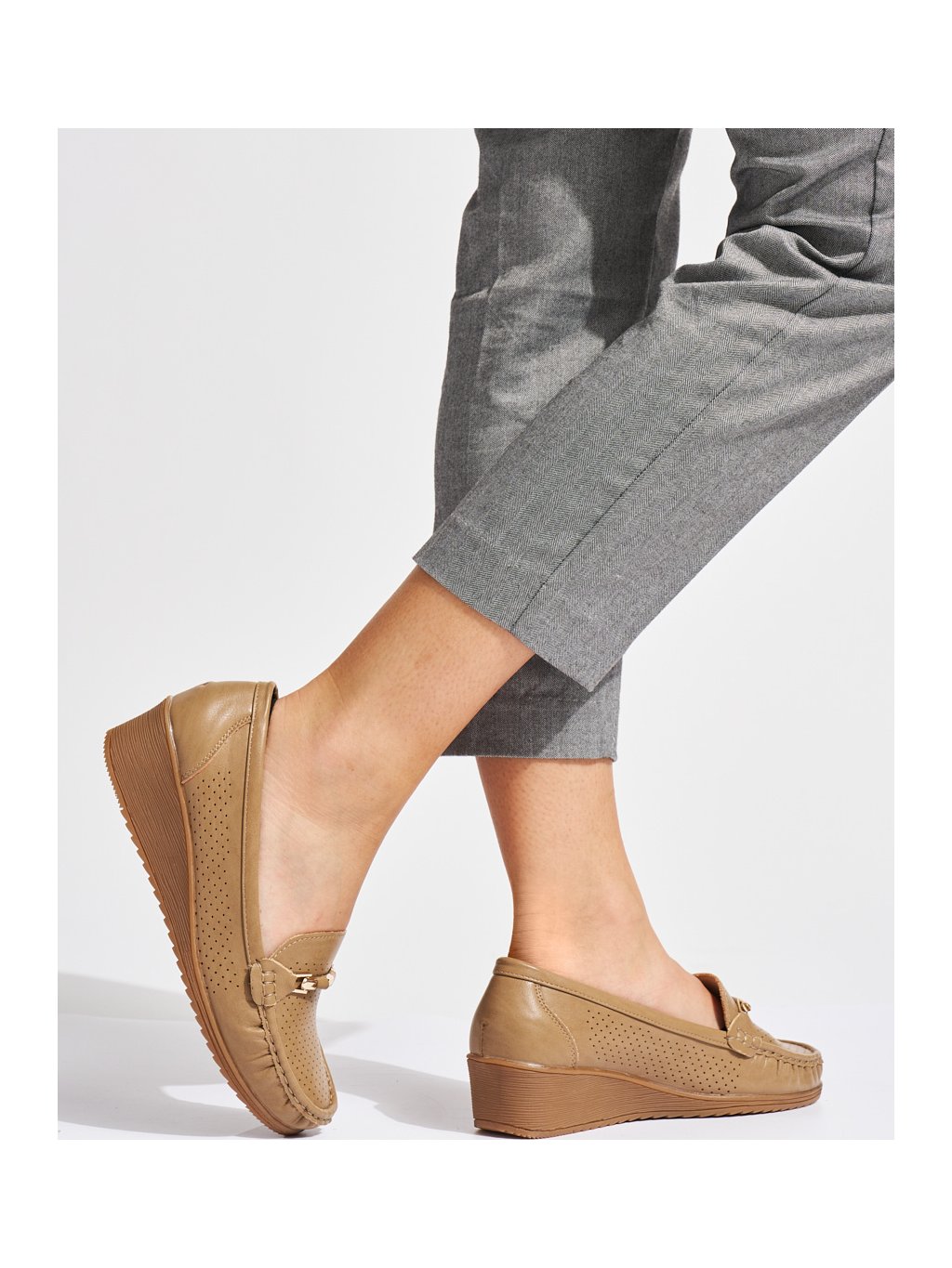 SVĚTLE HNĚDÉ DÍRKOVANÉ MOKASÍNY NA NÍZKÉM KLÍNKU