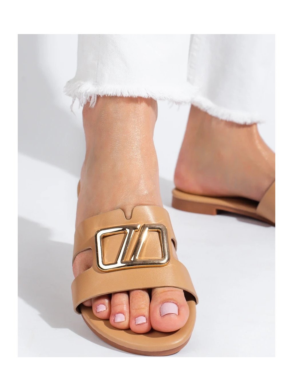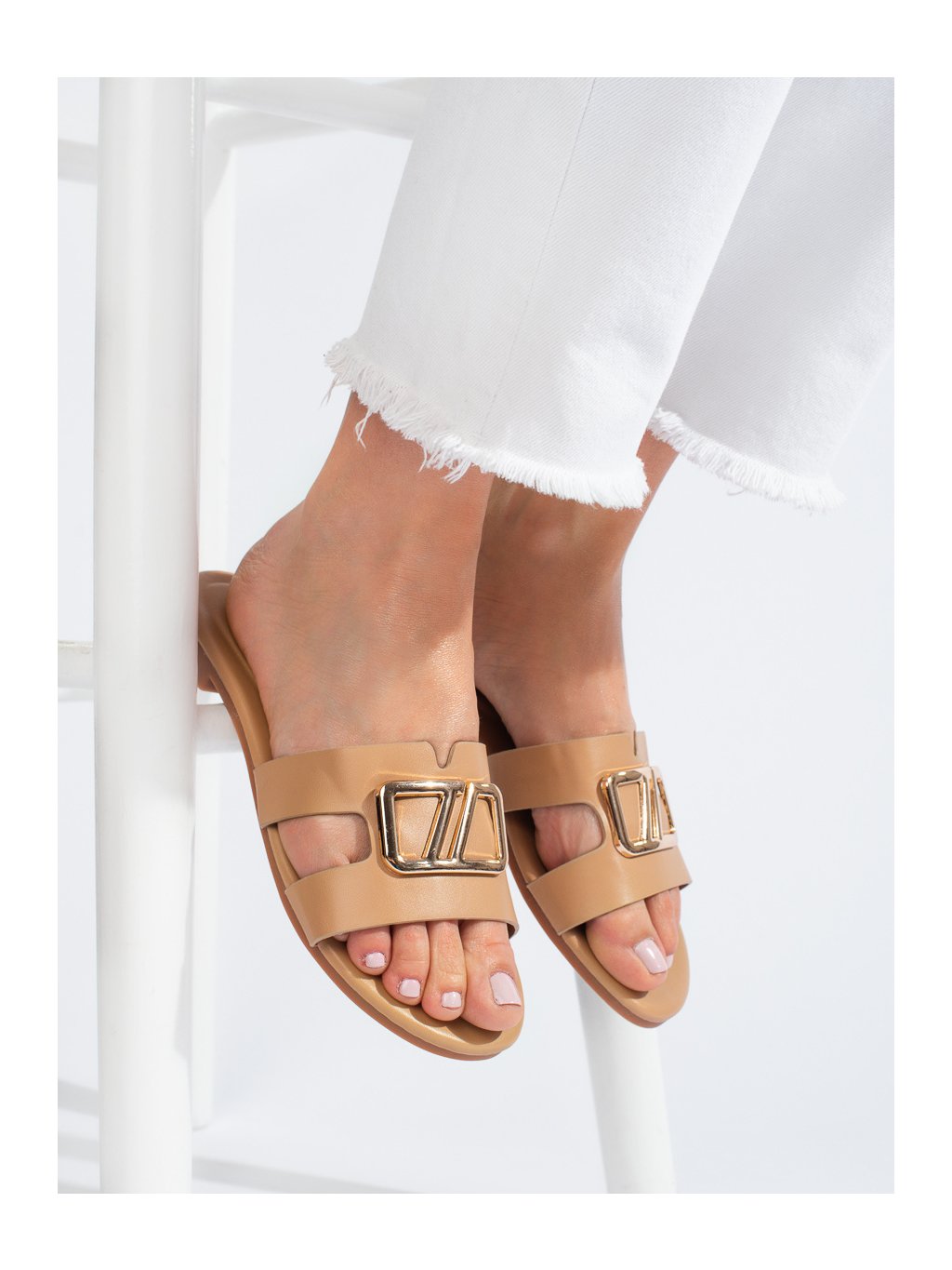 SVĚTLE HNĚDÉ PLOCHÉ PANTOFLE SE ZLATOU OZDOBOU - SHELOVET
