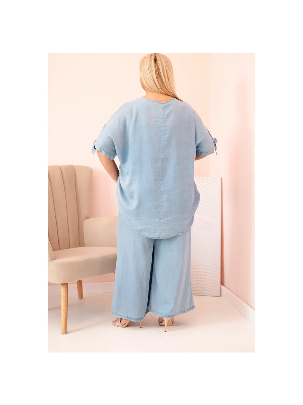 SVĚTLE MODRÁ DÁMSKÁ PLUS SIZE SOUPRAVA HALENKY A ŠIROKÝCH KALHOT