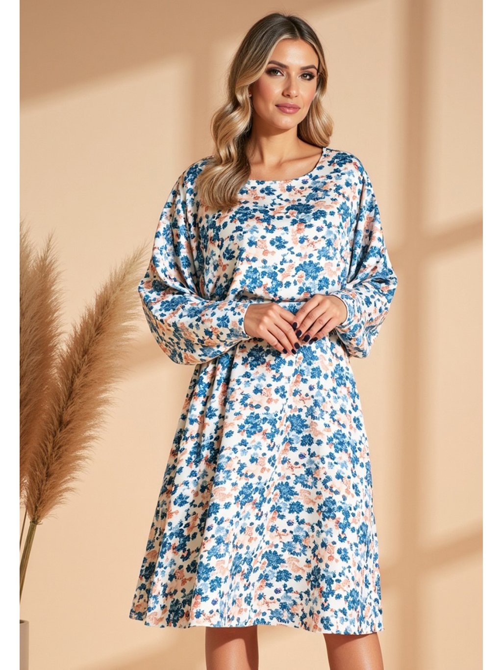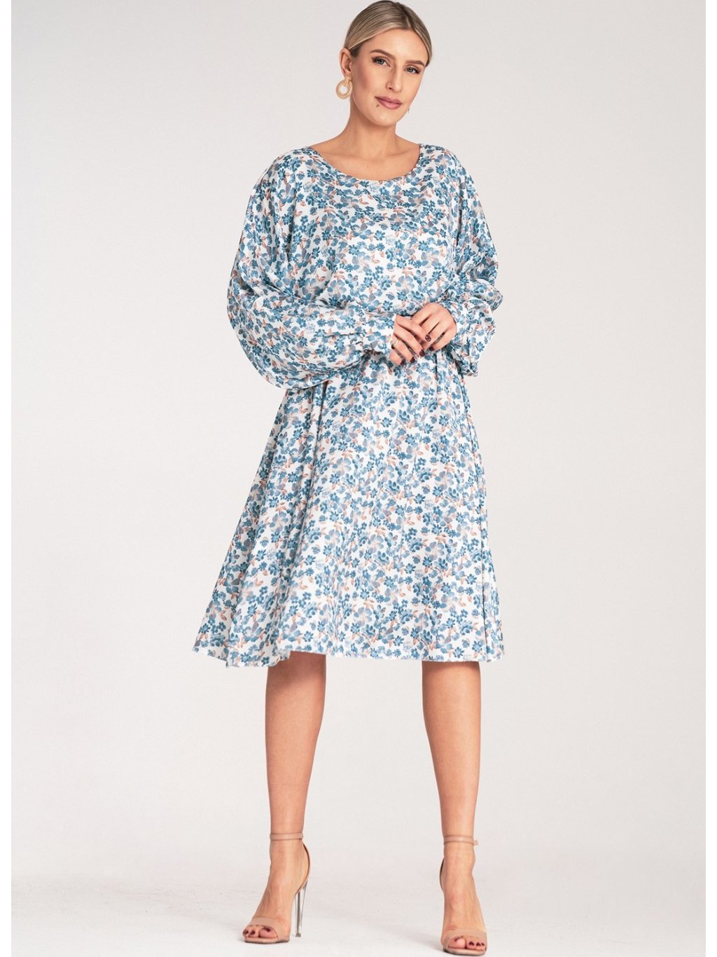 SVĚTLE MODRÉ DÁMSKÉ SATÉNOVÉ ŠATY S KVĚTINOVÝM VZOREM
