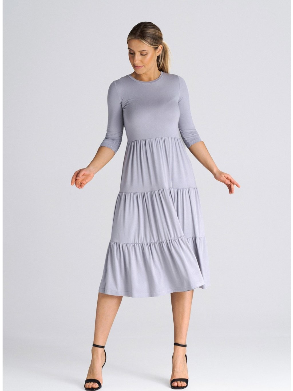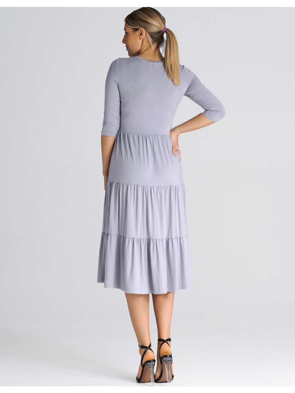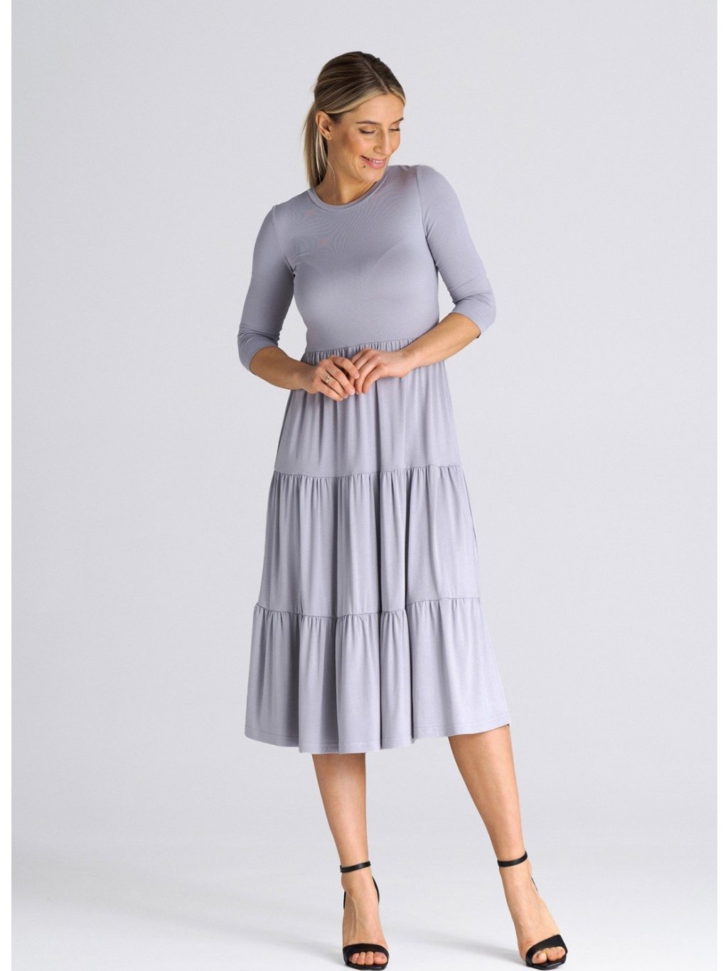 SVĚTLE ŠEDÉ MIDI ŠATY S VOLÁNY