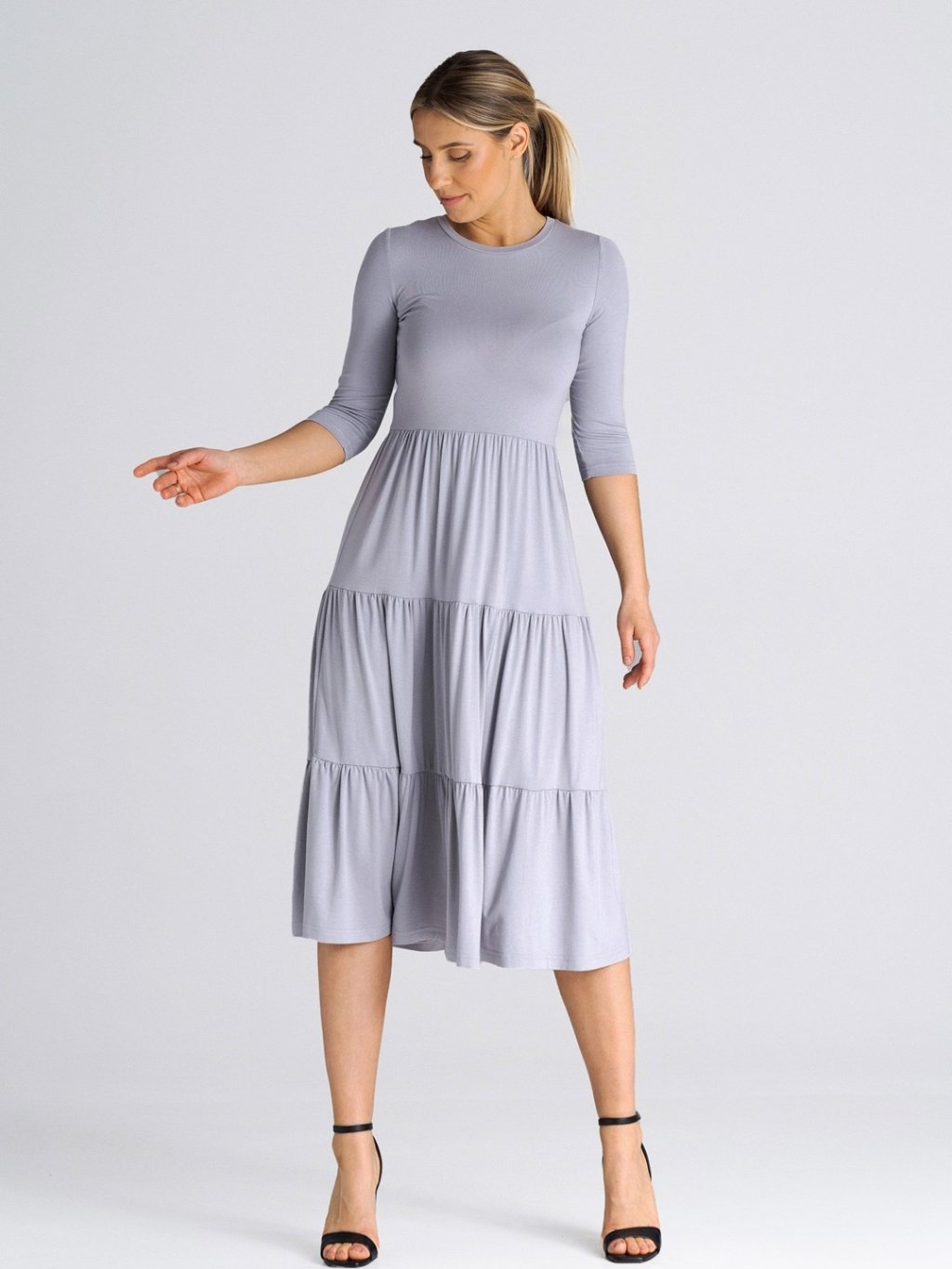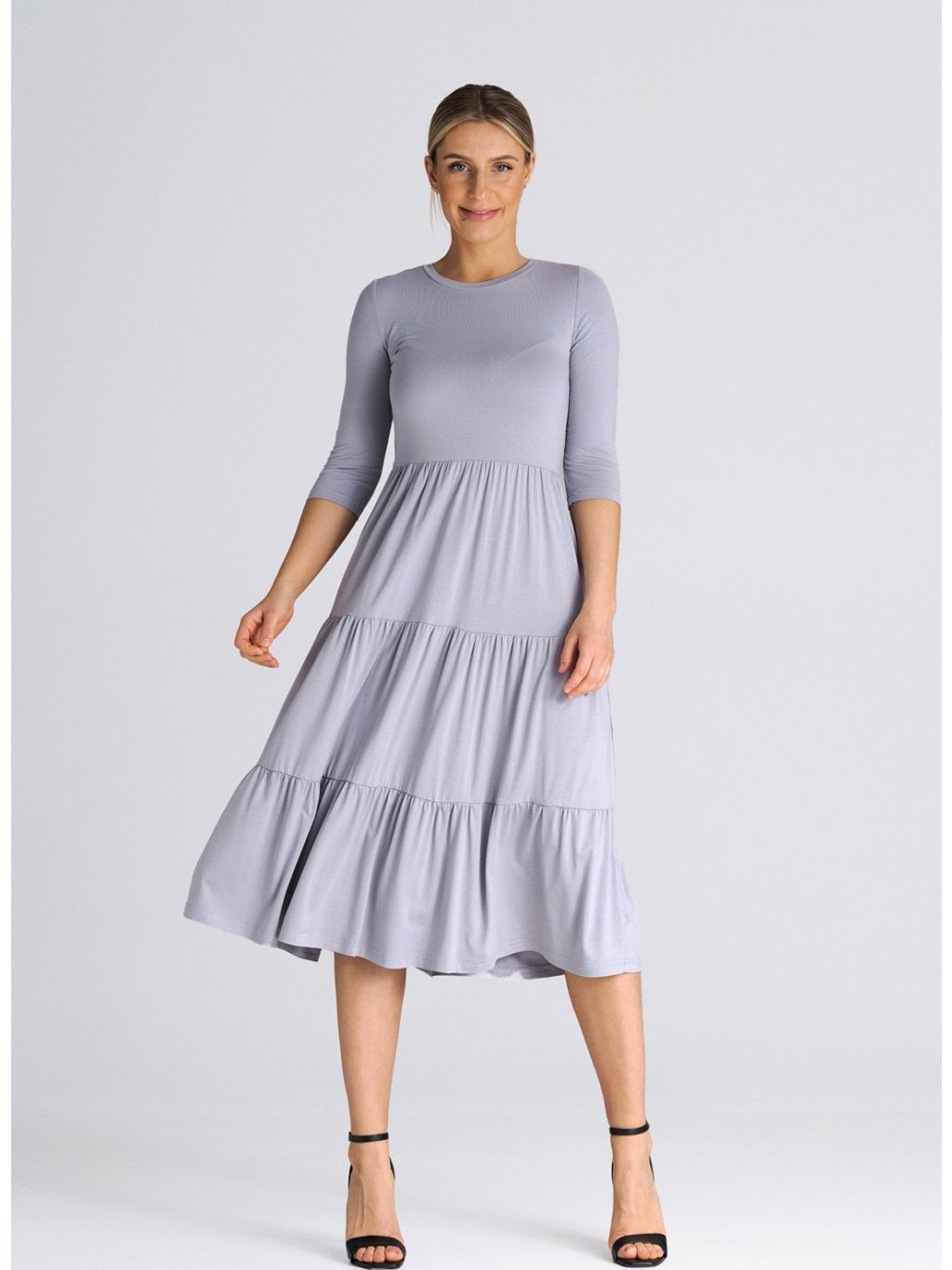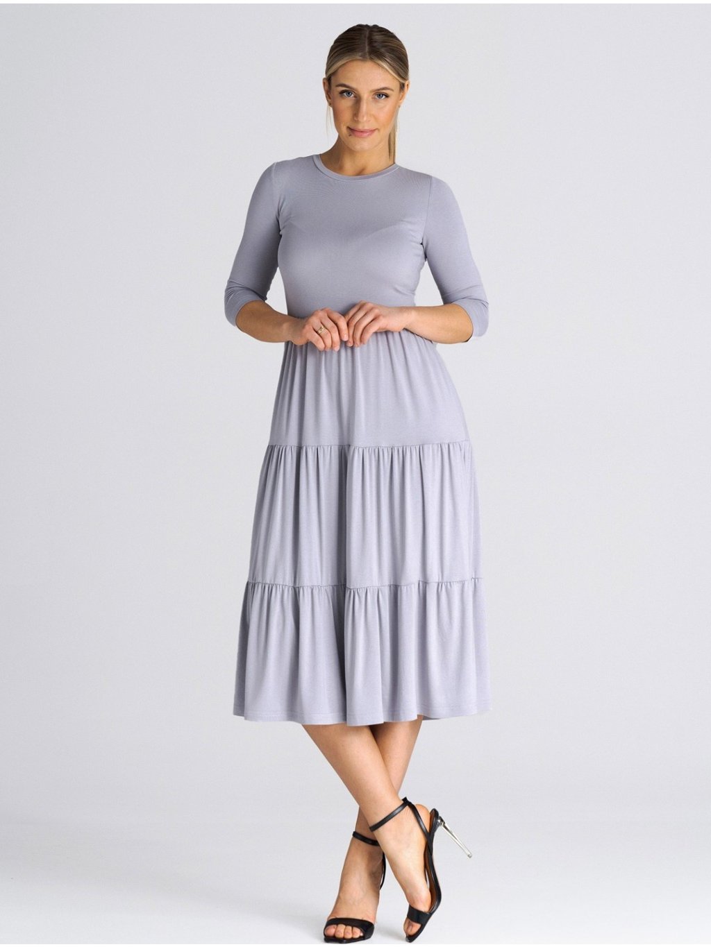 SVĚTLE ŠEDÉ MIDI ŠATY S VOLÁNY