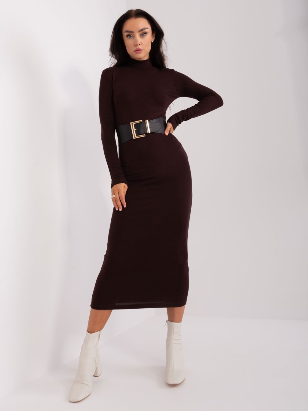 TMAVĚ HNĚDÉ MIDI UPLÉ ŠATY S PÁSKEM