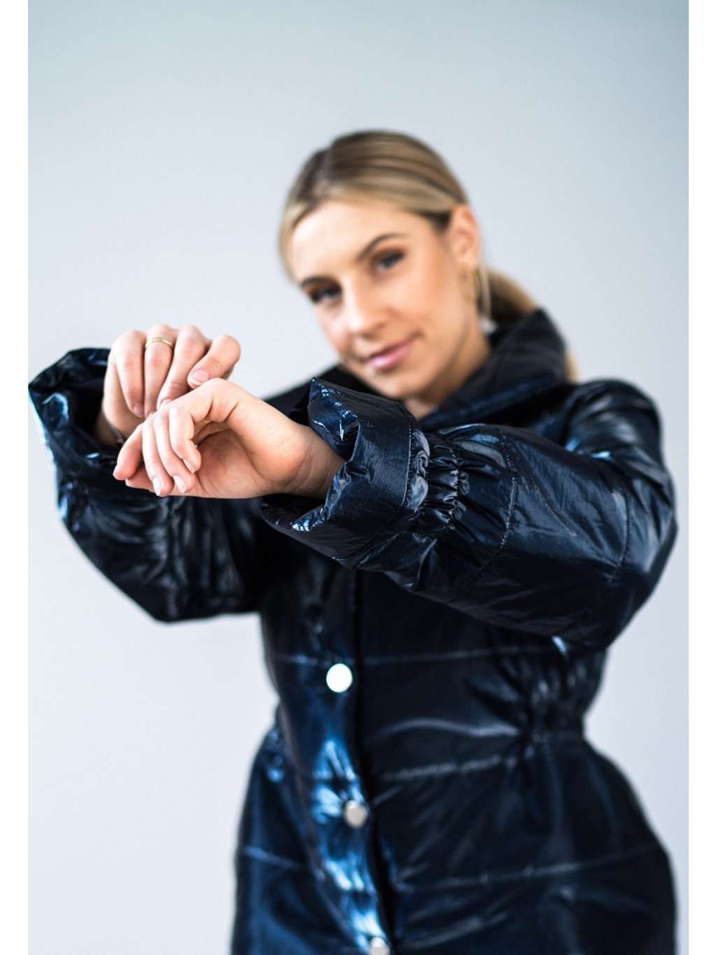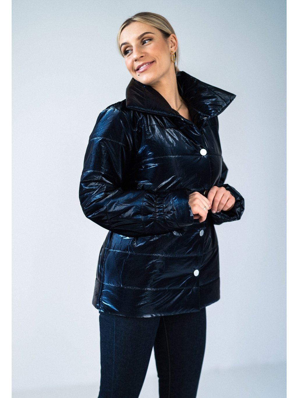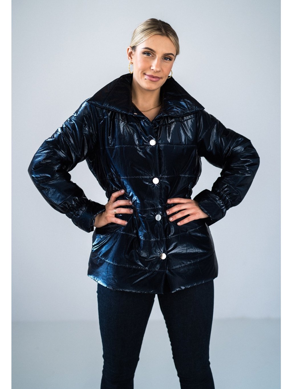 TMAVĚ MODRÁ LESKLÁ PROŠÍVANÁ BUNDA