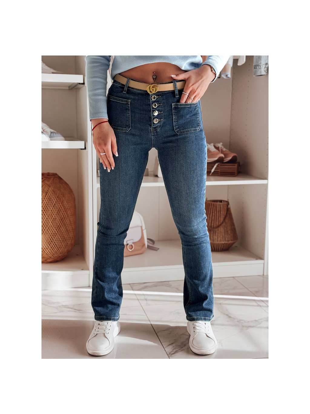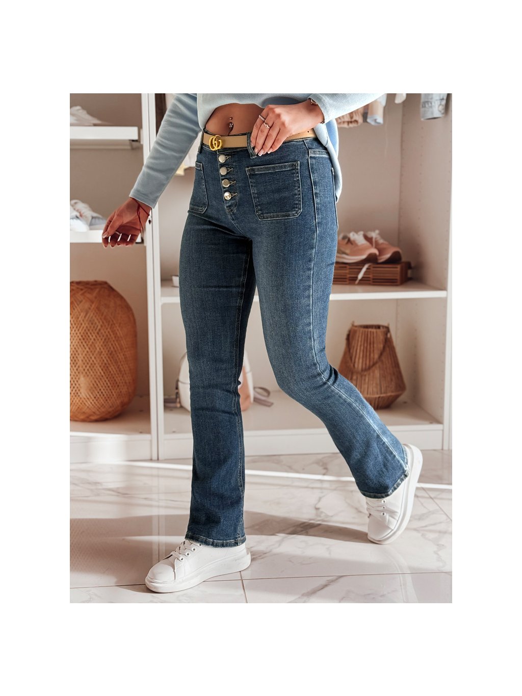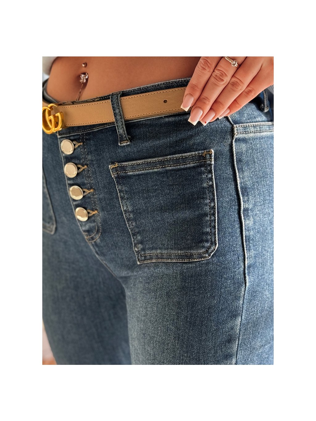TMAVĚ MODRÉ DÁMSKÉ DŽÍNY DO ZVONU S OZDOBNÝMI KAPSAMI BELLFLO