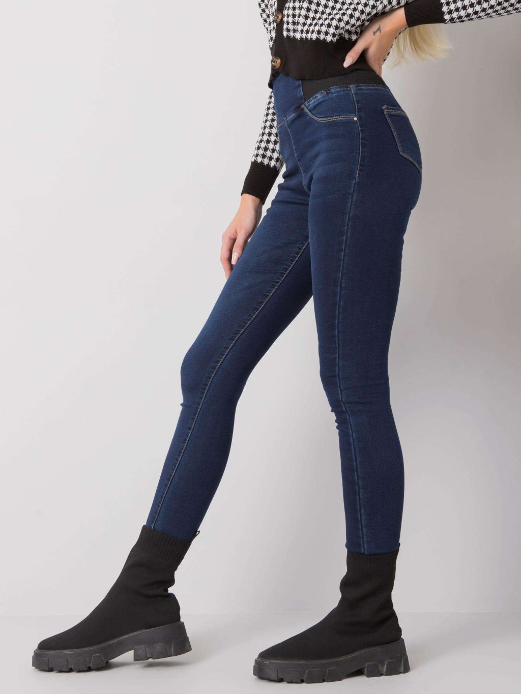 TMAVĚ MODRÉ DÁMSKÉ DŽÍNY S ELASTICKÝM PASEM