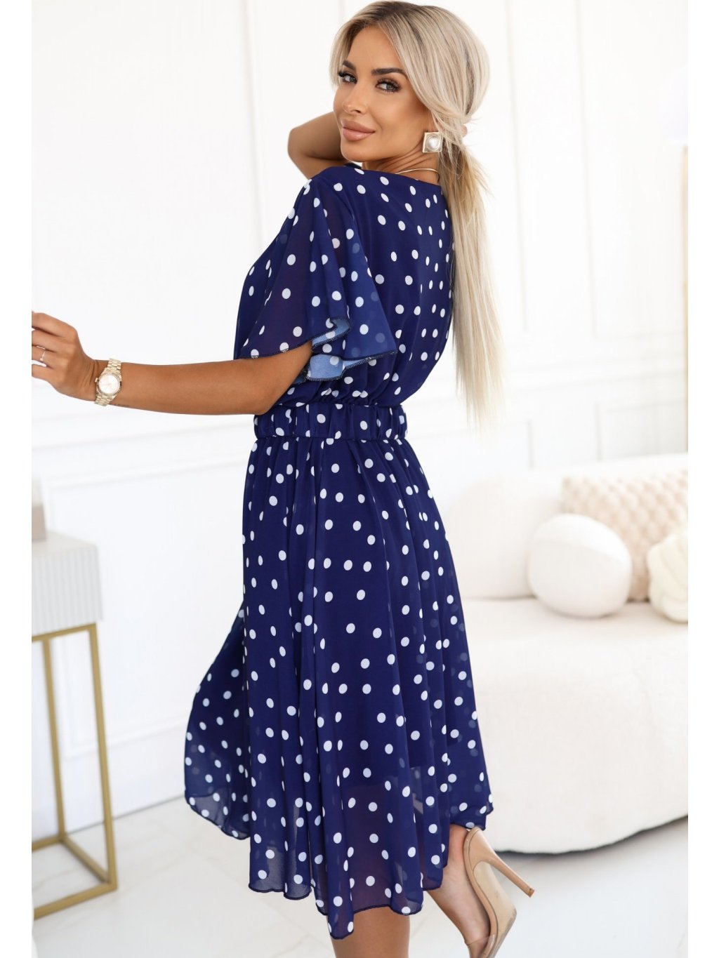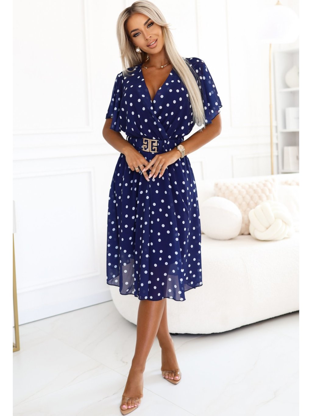 TMAVĚ MODRÉ ŠATY S BÍLÝMI PUNTÍKY A OZDOBNÝM PÁSKEM